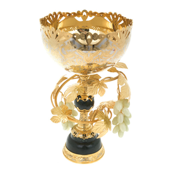 Окантовка чаши оформлена рельефным золотым орнаментом с жемчужной цепью по краю — каждая деталь выполнена в манере, характерной для европейских предметов XVIII века. Металлическое основание с лепными завитками и барочными ножками удерживает сосуд на пьедестале, придавая всей композиции устойчивость и величие. Цветочный декор продолжается по всему периметру, подчёркивая органику формы и превращая предмет в настоящую художественную реликвию.