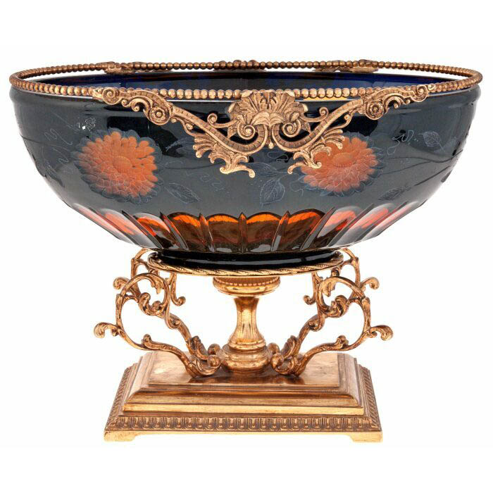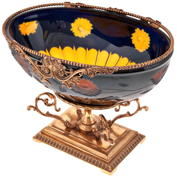 Фруктовница на ножке “Цветы” — воплощение декоративного триумфа, сочетающего тонкую работу стеклодува и роскошь литого металла. Глубокая чаша из тёмно-синего стекла украшена цветочными мотивами, выполненными в тёплых оттенках охры и терракоты, словно мерцающими на фоне вечернего неба. Внутренняя поверхность играет контрастом: сияющие жёлтые лепестки, словно подсвеченные изнутри, раскрываются навстречу свету, создавая эффект многослойного цветка, заключённого в стеклянную оболочку.