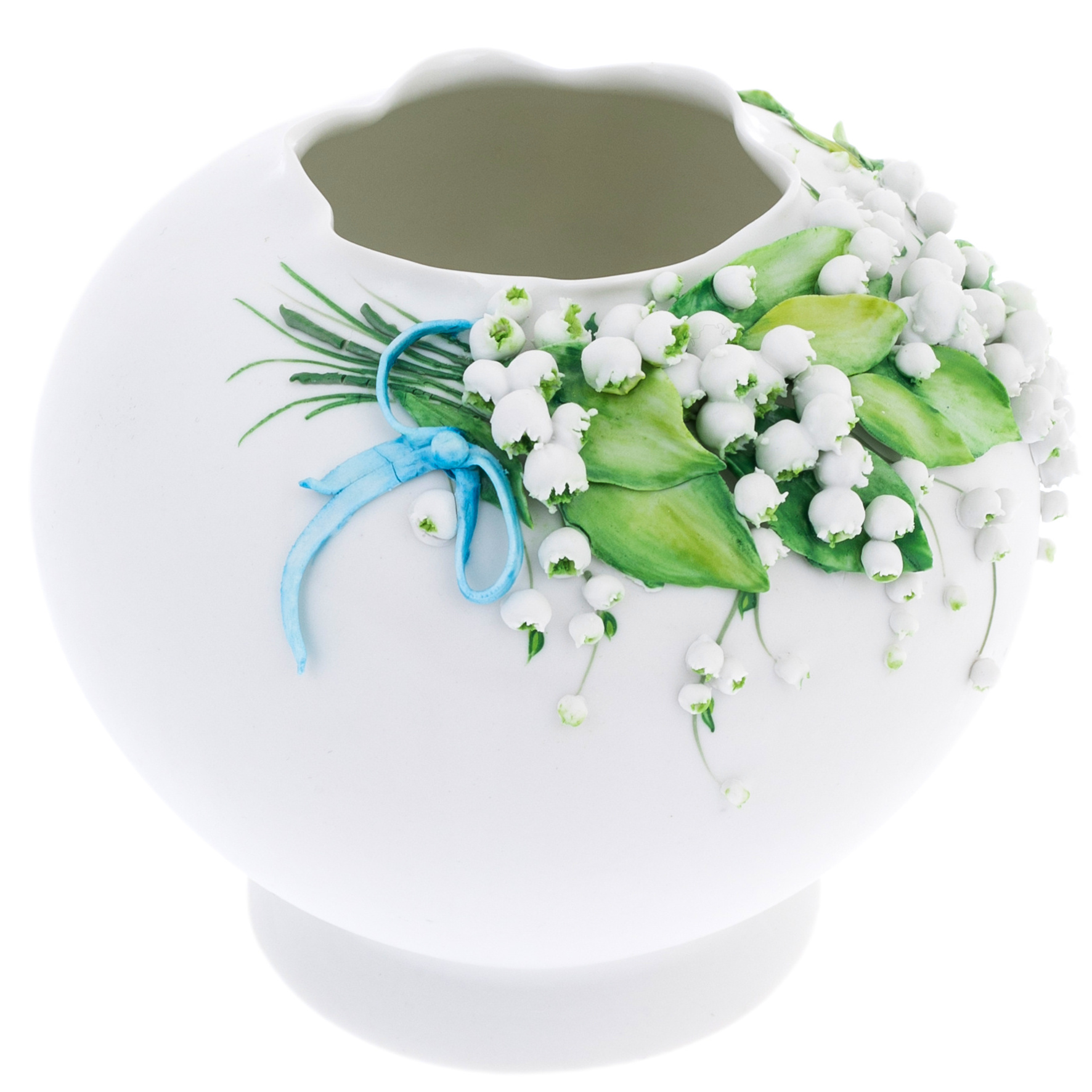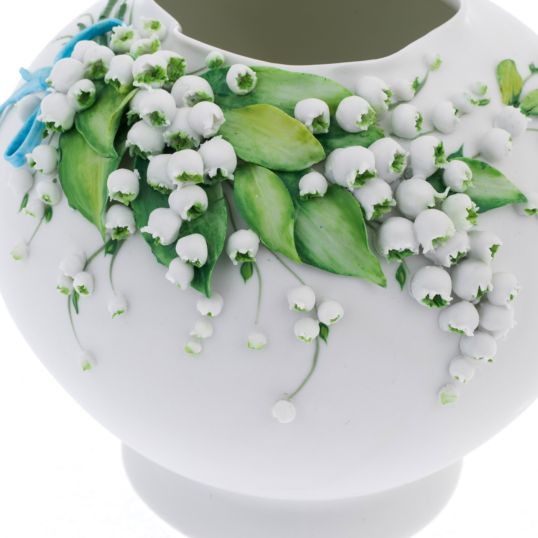 Рельефный орнамент с ландышами, декорированный вручную, напоминает о хрупкости и красоте мгновений, которые так ценны. Сочные зеленые листья обрамляют изысканные белоснежные колокольчики, а голубая ленточка добавляет композиции легкости и нежности. В каждом элементе чувствуется гармония природы и искусства, подчеркивающая исключительность изделия.