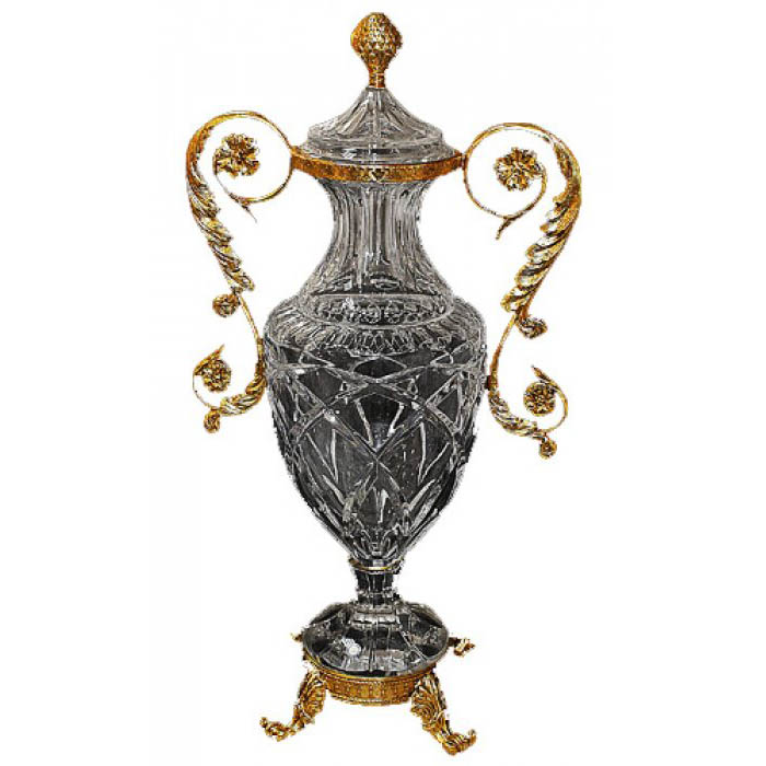 Напольная амфора с крышкой — это блистательный образец классической декоративной формы, воплощённый в хрустале и золоте. Высокая, стройная, с изящными очертаниями и совершенной симметрией, она словно отсылает к древнегреческим сосудам, переосмысленным в эстетике европейского барокко. Глубокие грани хрусталя ловят свет, преломляя его в тысячах сверкающих граней — от основания до венчающей крышки. На поверхности — сложный геометрический узор, подчёркивающий прозрачную архитектуру сосуда и создающий эффект драгоценного камня, выросшего из рук мастера.