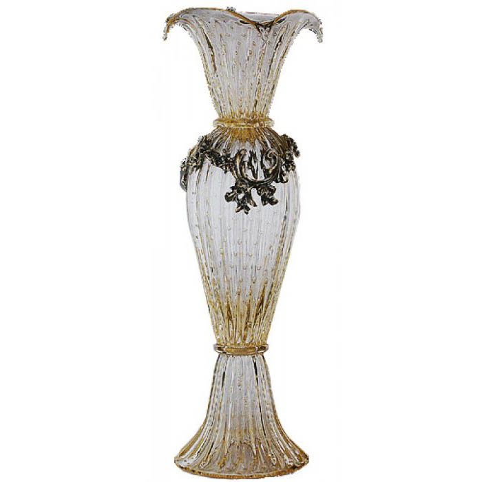 Напольная хрустальная ваза «Мелодия» — это визуальный аккорд утончённости и лёгкости, исполненный в хрустале с золотистым напылением и акцентами из металла. Её форма словно подражает движению цветка, только что распустившегося на рассвете: изогнутый край горлышка, плавные вертикальные линии, визуально вытягивающие силуэт, и широкое основание, придающее устойчивость и завершённость. Тонкая фактура стекла, украшенная рельефной текстурой с вкраплениями золота, создаёт игру света, будто ваза пульсирует изнутри мягким сиянием.