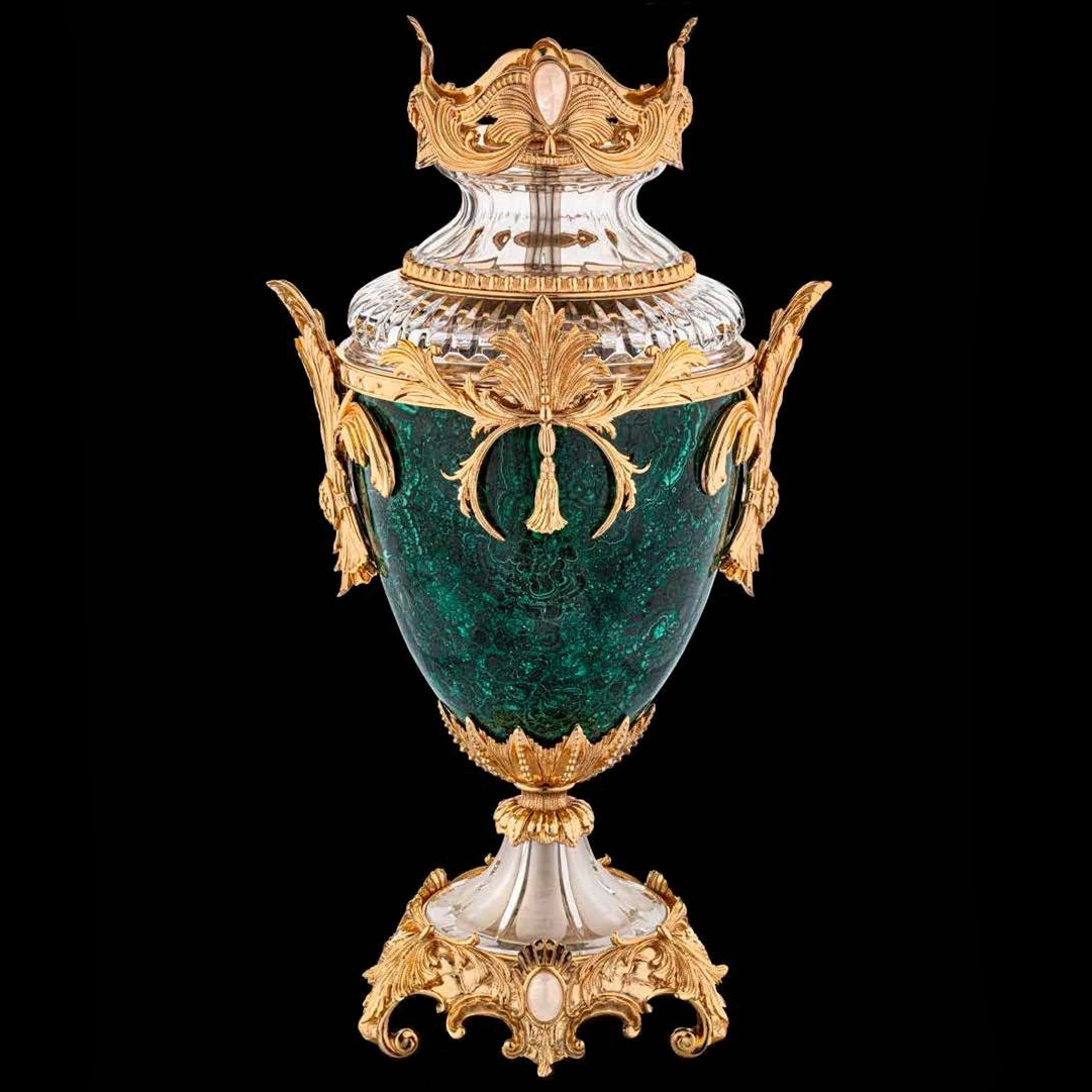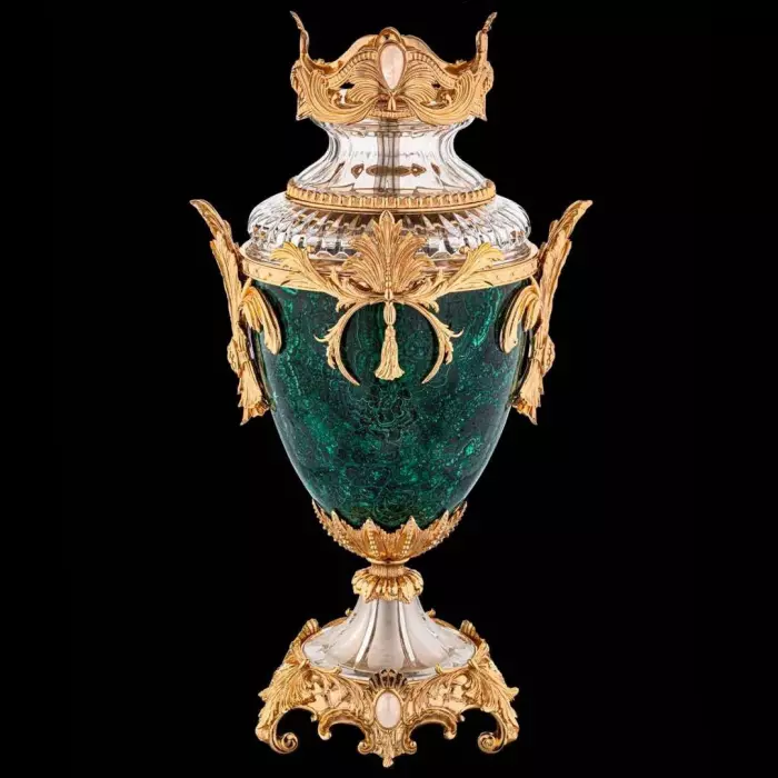 Ваза из малахита и хрусталя «Glory» — выразительное интерьерное произведение, в котором насыщенная глубина природного камня соединена с прозрачной лёгкостью хрусталя и благородством металла. Основной объём чаши выполнен из малахита с характерным живым рисунком, формирующим уникальную фактуру поверхности, тогда как верхняя часть из огранённого хрусталя добавляет композиции свет и визуальную воздушность. Бронзовые элементы с золочением образуют сложный декоративный каркас с изящными ручками и орнаментальными акцентами, усиливая торжественный характер изделия. Такая ваза предназначена для интерьеров, где ценится статус, художественная выразительность и редкость материалов.