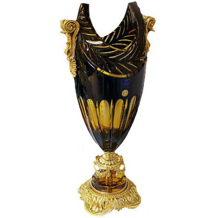 Напольная ваза из тёмно-медового стекла на массивной бронзовой подставке — произведение, в котором каждая деталь продумана для того, чтобы завораживать, подчёркивать статус и не оставлять пространства для компромиссов. Глубокий цвет корпуса, переходящий от почти чёрного к карамельному, насыщен внутренним свечением и бликами, отражающими рельефную гравировку и ручную огранку. Эффект драпировки в верхней части вазы, имитирующий свитую ткань, украшен резным узором в виде стилизованных колосьев, придающим всей композиции символику изобилия и благополучия.