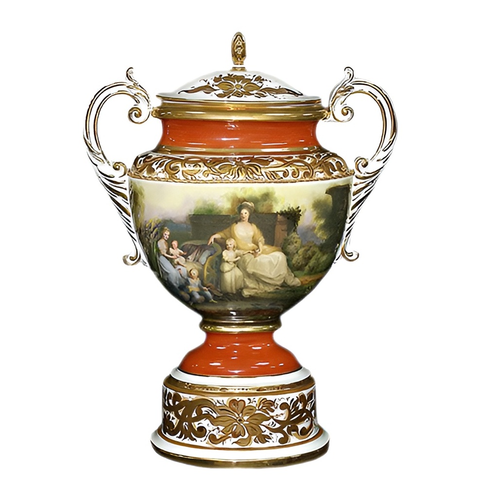 Напольная ваза с крышкой «Приятный отдых» — это шедевр классического европейского фарфора, рожденный на стыке декоративного искусства и жанровой живописи. Массивная форма с идеальной симметрией подчёркивает величие предмета, а его плавные очертания словно зовут рассмотреть каждую деталь поближе. Основу визуального образа составляют живописные сцены: на одной стороне изображена прогулка благородного семейства в пасторальном парке, на другой — сцена отдыха с детьми и гувернантками. Эти сюжеты, написанные вручную, отражают эстетику XVIII века и создают ощущение прикосновения к ушедшей эпохе изящных манер, театра, загородных вилл и неторопливой жизни.