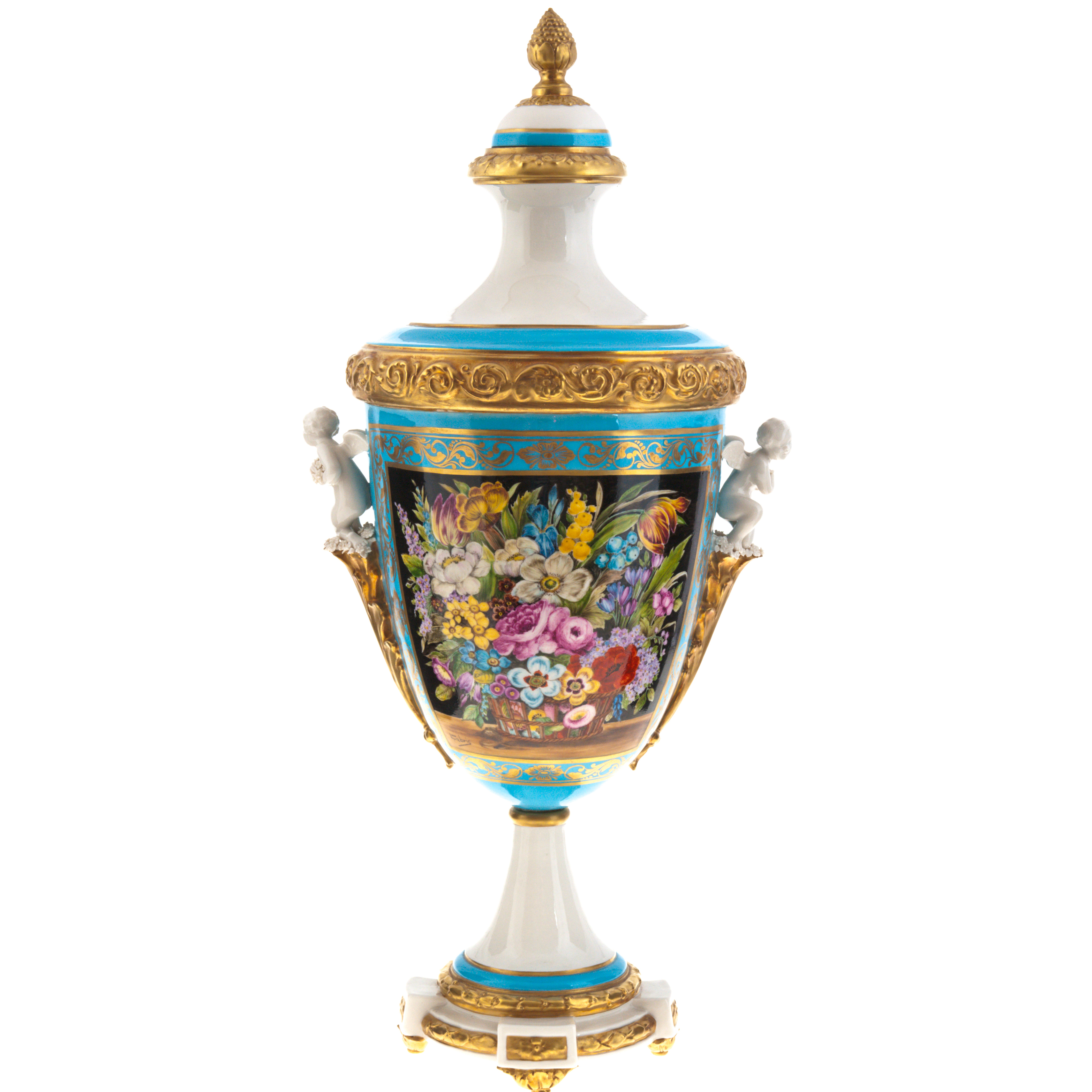 Настольная амфора «Империя» — образец парадного декоративного фарфора, в котором воедино сошлись римская мощь, французская изысканность и итальянская живописность. Её форма — строгая и торжественная — уравновешена живой цветочной росписью, напоминающей фламандские натюрморты: сочные пионы, нарциссы, ирисы и тюльпаны, вписанные в чёрный фон картуша, расцветают у подножия голубого неба и золотых орнаментов. Это произведение словно несёт в себе дыхание музейной коллекции, созданной не для украшения — для созерцания.