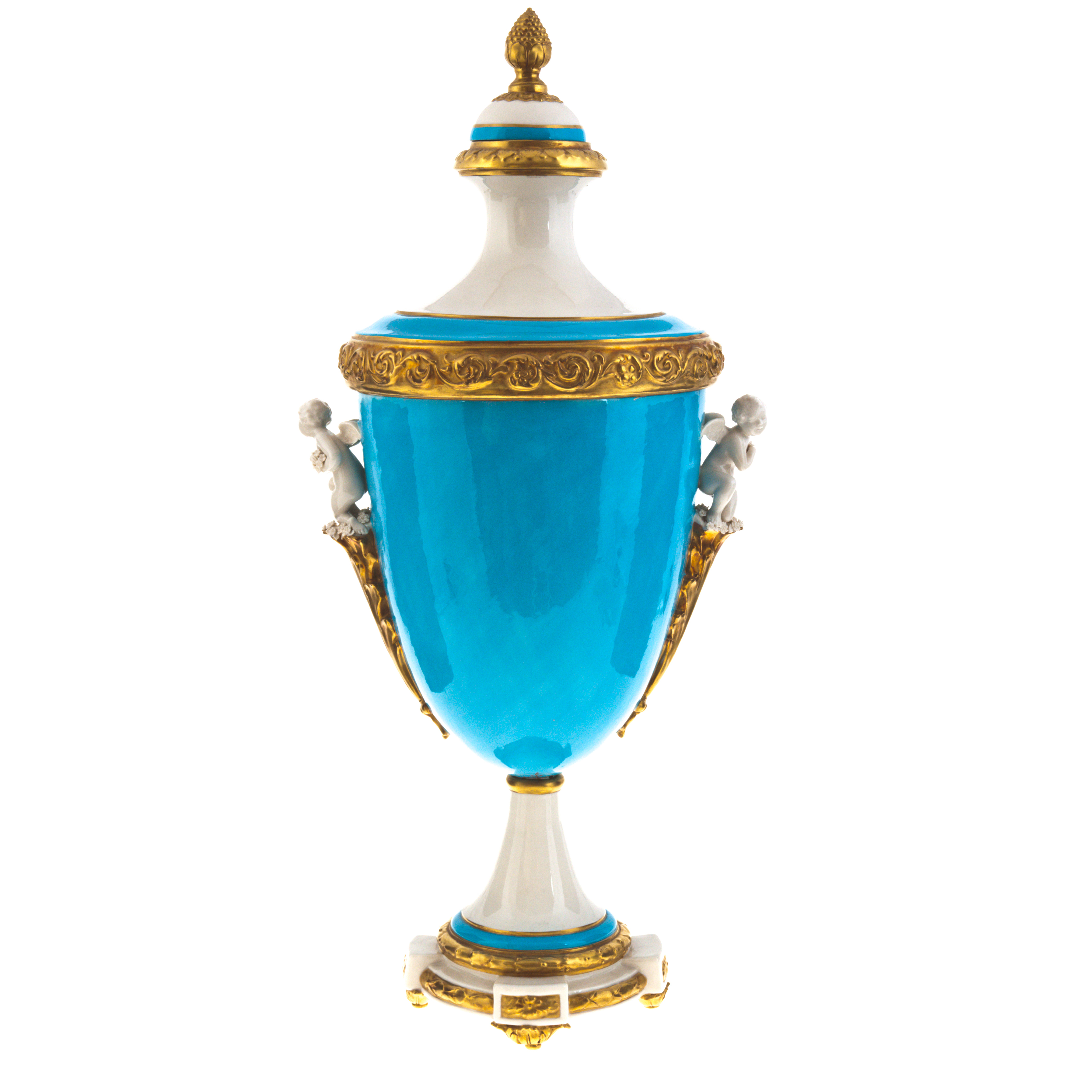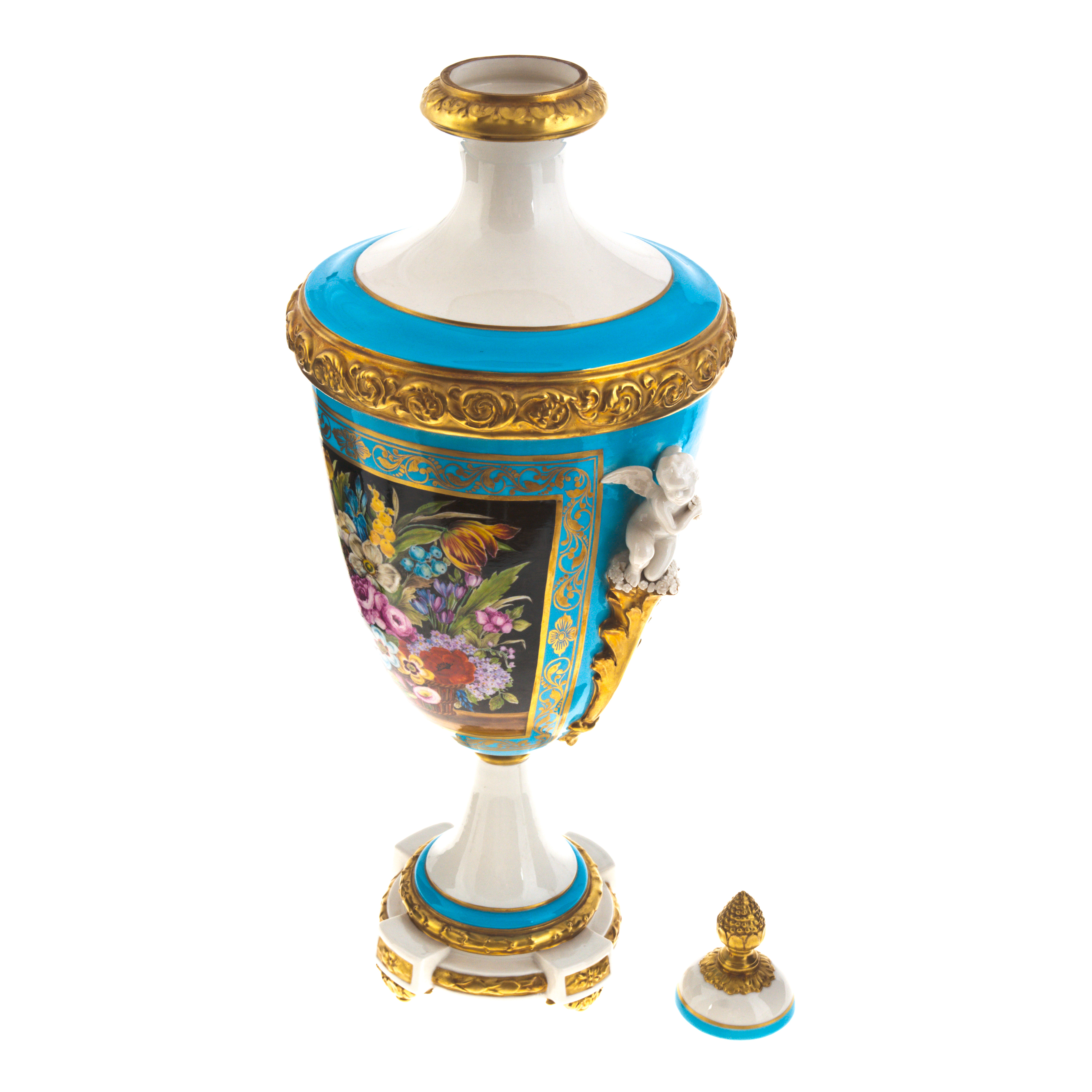 Выполненная из первоклассного фарфора, амфора покрыта ручной росписью, дополненной роскошной позолотой и небесно-голубой эмалью. Рельефный пояс с античными завитками, миниатюрные скульптурные фигуры по бокам, устойчивая ножка и массивная крышка с шишкой-навершием образуют идеальный симметричный ансамбль. Благодаря контрасту между глянцевыми поверхностями и матовыми деталями вазу хочется не только видеть, но и ощущать как тактильную ценность. Каждая линия здесь подчёркивает принадлежность предмета к миру высокого искусства.