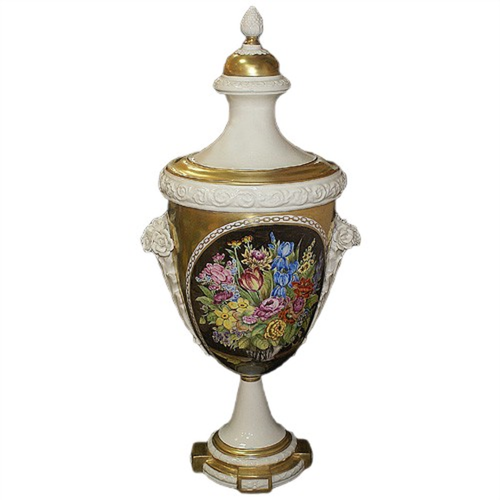 Настольная амфора «Империя» — малая по формату, но величественная по характеру, — воплощает представление о гармонии, симметрии и статусной красоте. Силуэт изделия отсылает к античным сосудам, служившим символами власти и ритуала, а исполнение — к традициям европейского фарфора эпохи Наполеона. Белоснежное основание плавно переходит в золотистую чашу, на которой центральное место занимает живописная картуша с цветочной композицией в духе голландской школы: насыщенные, проработанные до лепестка ирисы, пионы, тюльпаны и васильки распускаются на тёмном фоне, создавая эффект живого полотна.