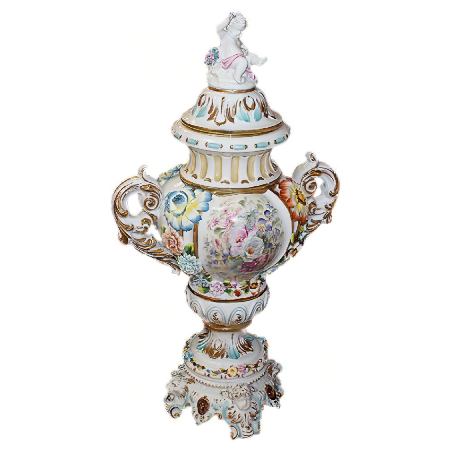 Амфора «Мейсен» — триумфальная симфония барокко, воплощённая в фарфоре, золоте и пастельной живописи, искусно соединённая в предмете, который давно вышел за пределы декоративной функции. Великолепная форма с изогнутыми ручками, пышным основанием и фигурной крышкой венчается скульптурным изображением амура — символа лёгкости, изобилия и чувственности. Главный объём сосуда украшен рукописным цветочным букетом в духе саксонской живописи: пион, роза, ирис, василёк и анютины глазки образуют цветочную фреску, излучающую спокойную роскошь и изящество.