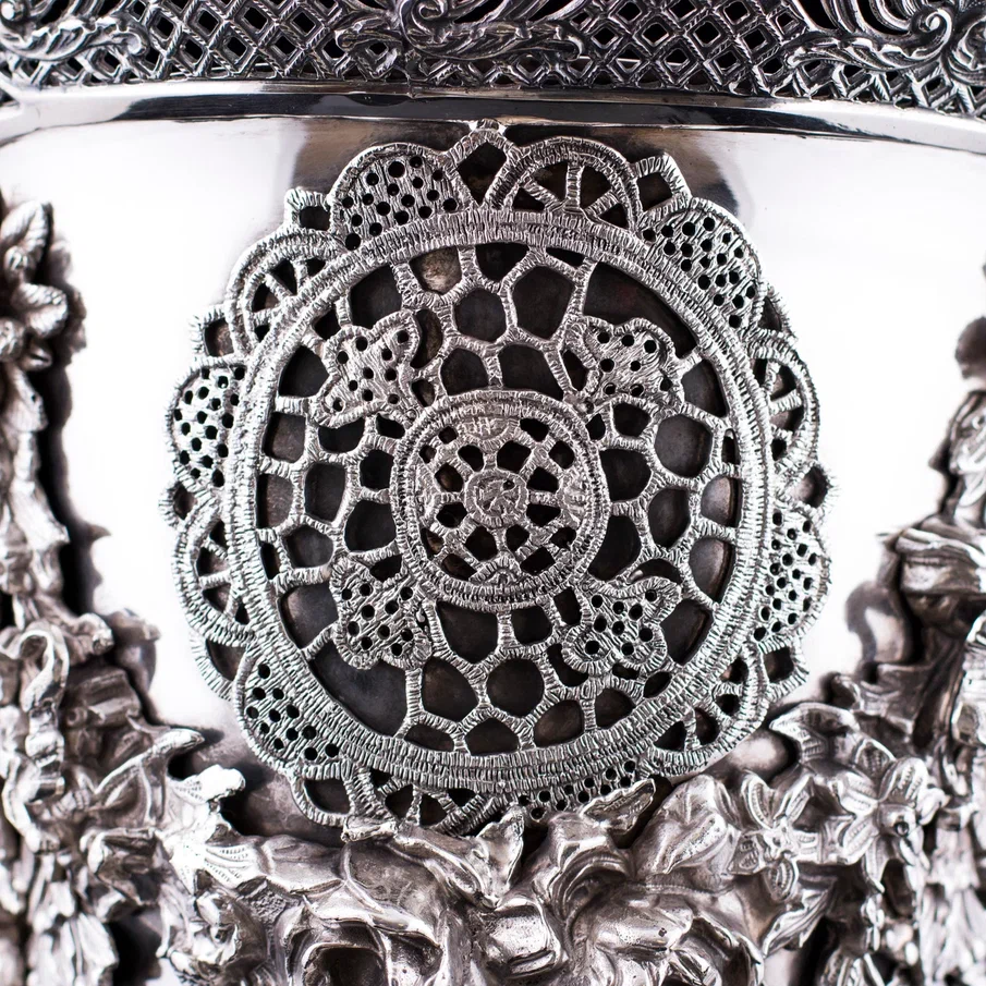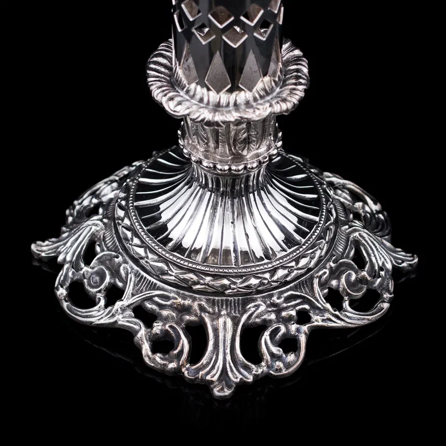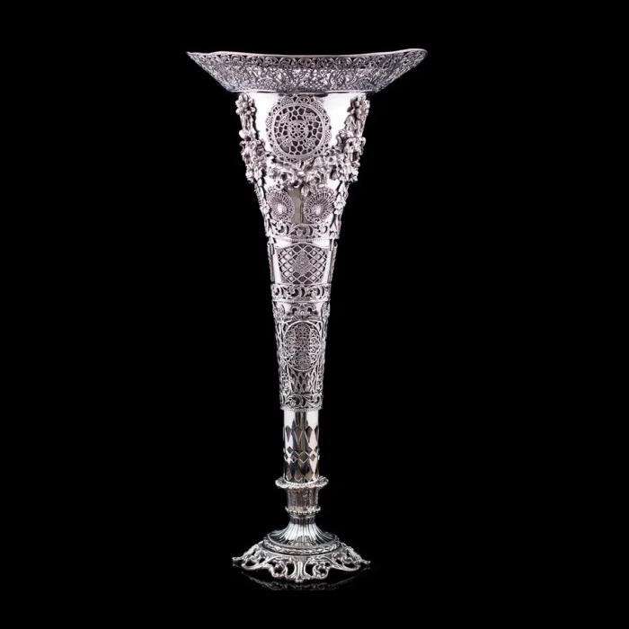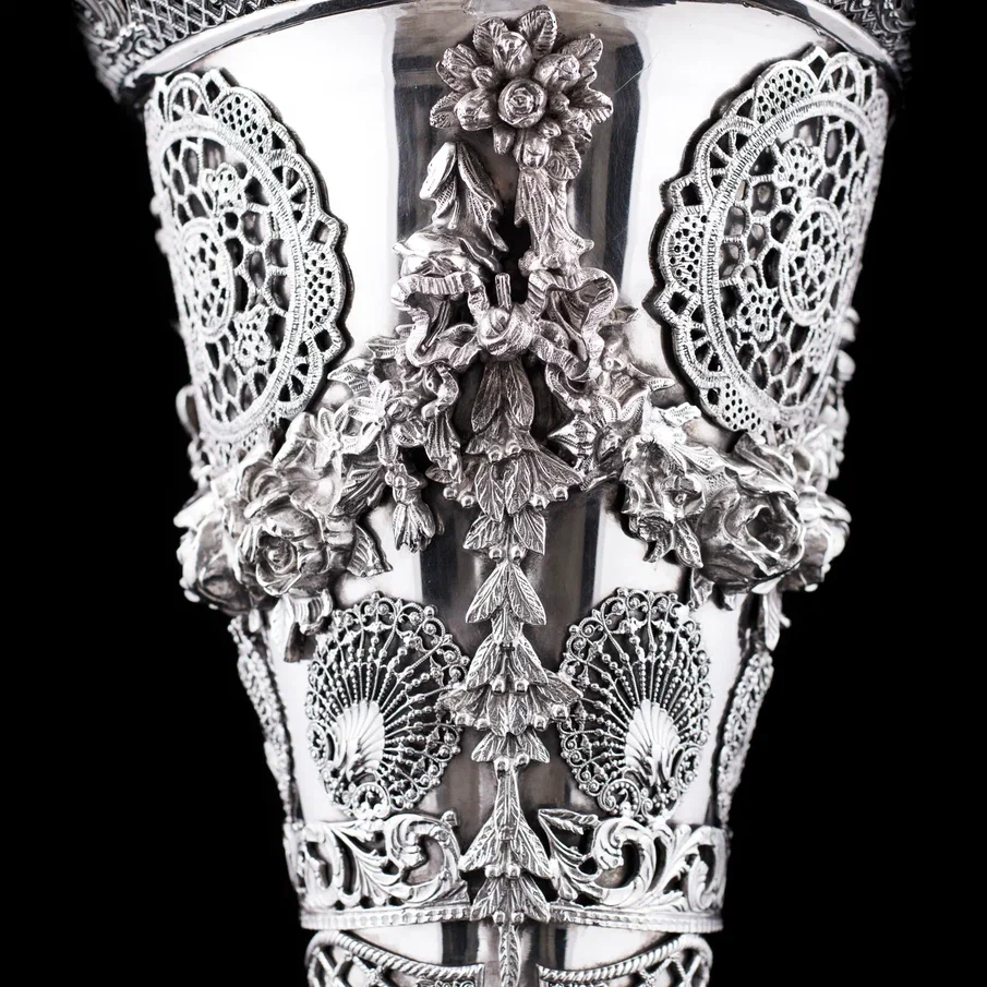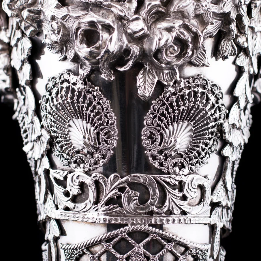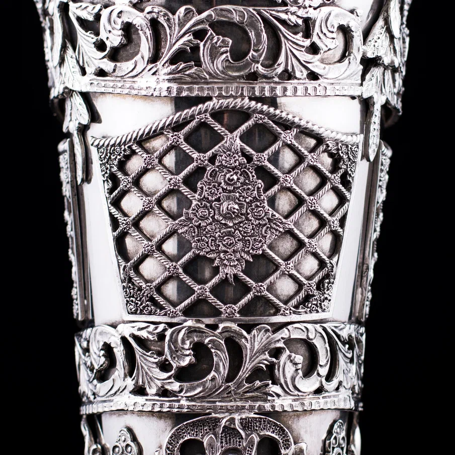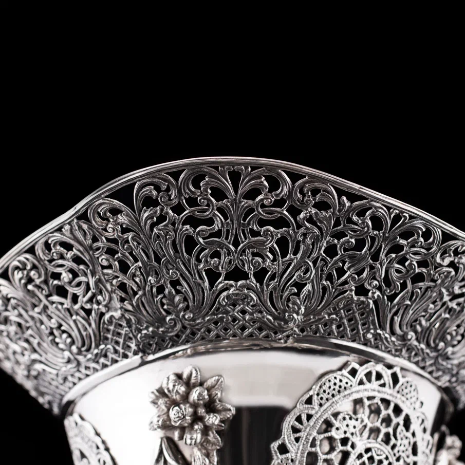 Рельефная флористика, раскинувшаяся по всей поверхности, придает вазе барочную пышность, а тончайшая сетка ажура создает впечатление невесомости. Филигранное плетение, вплетенное в общий узор, демонстрирует безупречный вкус и уважение к традициям ювелирного искусства. Основание украшено объемными завитками, перекликаясь с декоративными элементами корпуса, и плавно перетекает в граненую ножку, придающую вазе гармоничную завершенность.