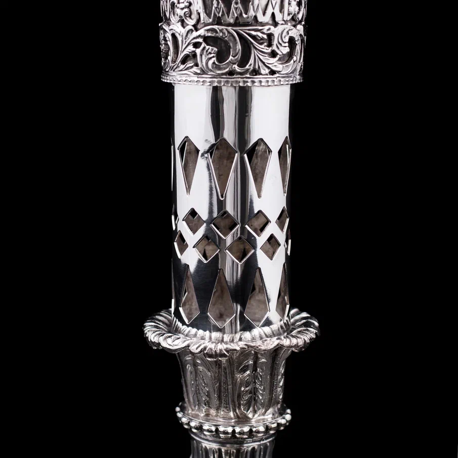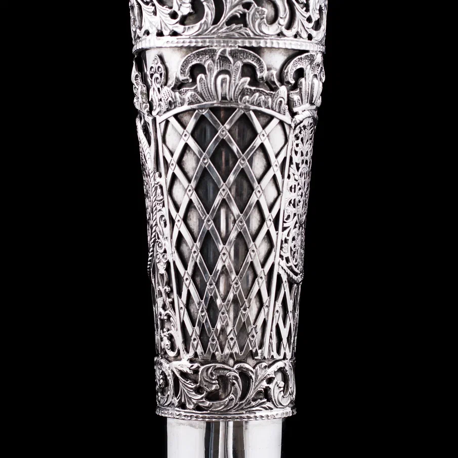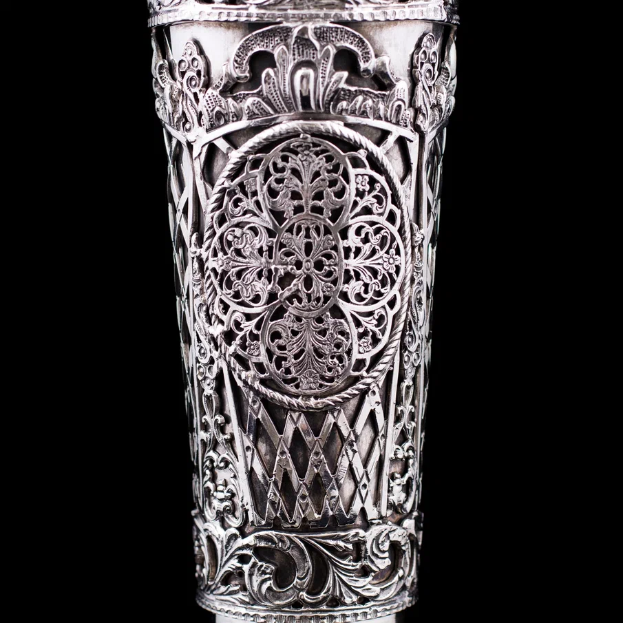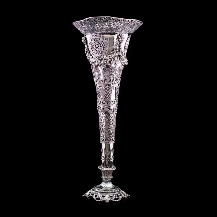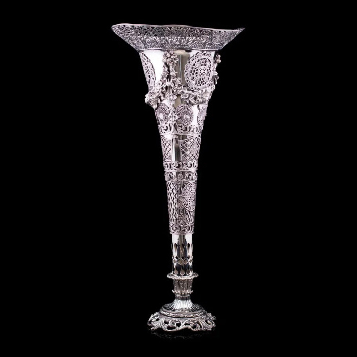 Серебряная ваза «Сицилия» — воплощение высочайшего мастерства, грации и безупречной эстетики. Каждая ее деталь создана с филигранной точностью, демонстрируя богатство орнаментов и игру света на благородном металле. Изящный контур корпуса устремляется вверх, расширяясь в роскошный венчик, окантованный воздушным ажурным узором, напоминающим венецианское кружево. Нижняя часть декорирована сложными геометрическими мотивами, переходящими в грациозные цветочные гирлянды, дополненные рельефными розетками и растительными элементами.