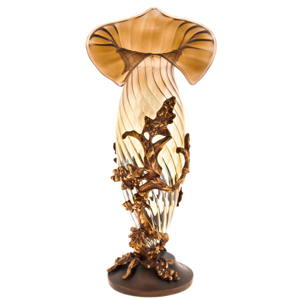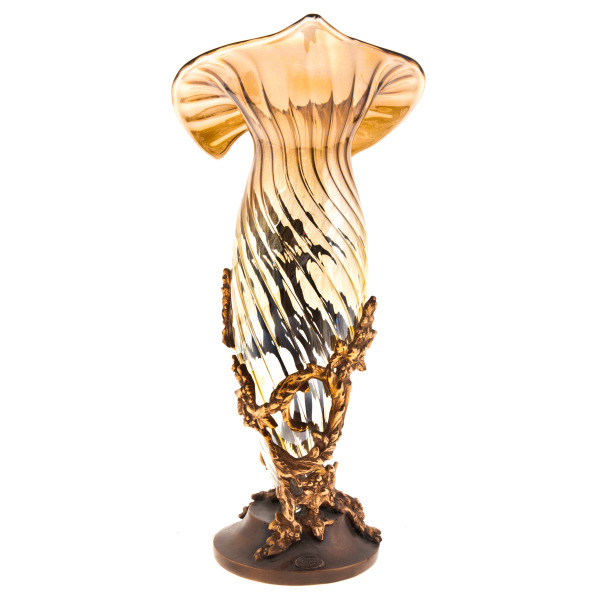 Особую пластичность форме придаёт бронзовая композиция, охватывающая основание и поднимающаяся по корпусу в виде ветви плюща. Лепка листвы выполнена вручную: каждая жила, изгиб, прожилка точно воспроизводит живую структуру. Позолоченная патина бронзы сочетается с тёмной поверхностью стекла, усиливая образ контраста — света и тени, металла и стекла, статики и жизни. Овальная ножка украшена золотыми листьями, создавая прочную и вместе с тем поэтичную основу для всей конструкции.