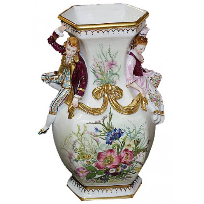 Фарфоровая ваза «Дрезда» — камерное произведение, в котором оживает эпоха рококо со всей её чувственностью, игривой театральностью и декоративной щедростью. Белоснежное основание, украшенное пышным многоцветным букетом ручной росписи, служит фоном для скульптурной сцены: по бокам композиции расположены изысканные фигуры юноши и девушки, застывшие в романтическом диалоге. Их костюмы, расписанные с филигранной точностью, напоминают бальный наряд французского двора XVIII века, а позы полны лёгкой грации и тонкой интриги.