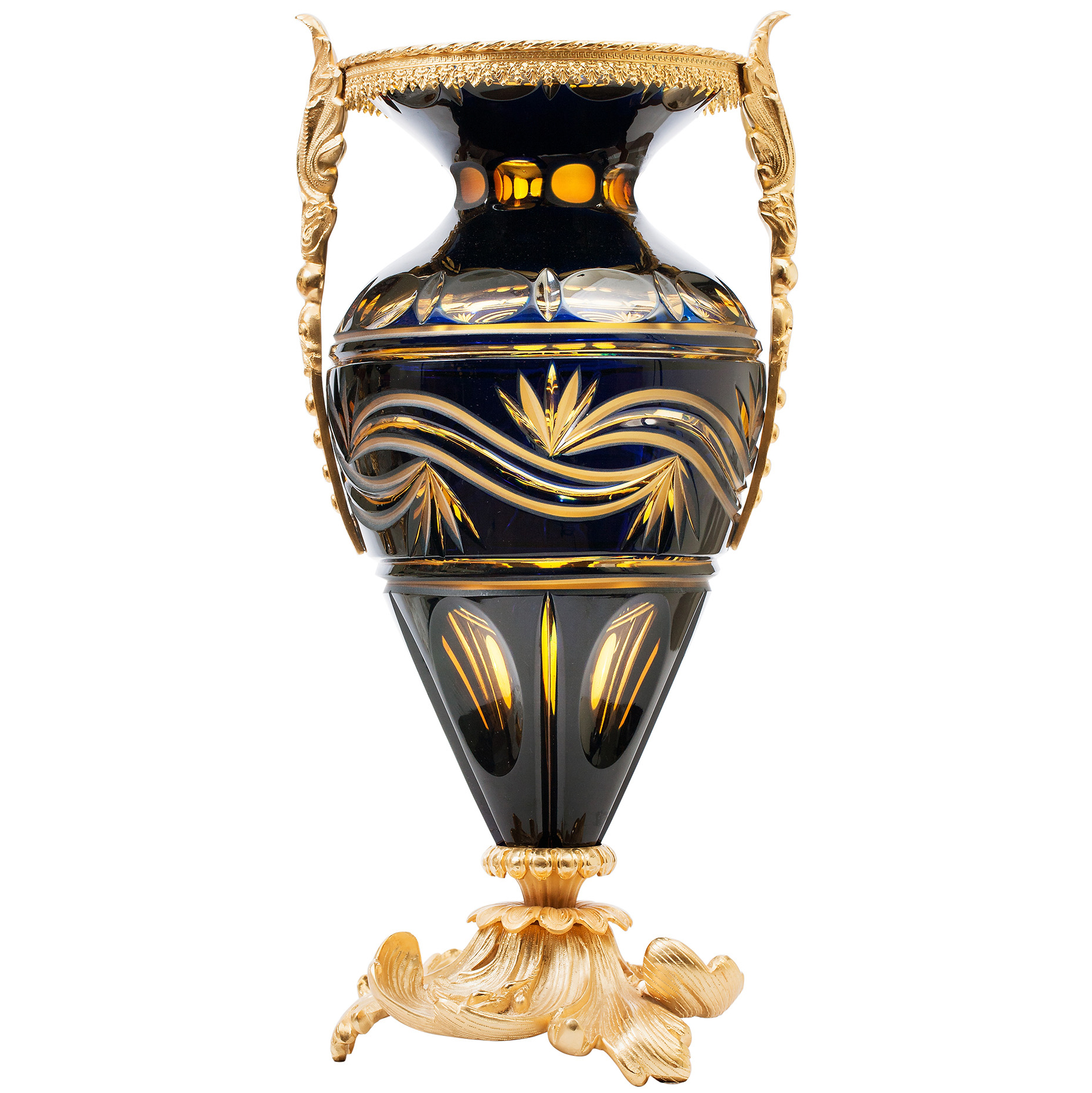 Отражение блеска королевских резиденций, воплощение триумфа искусства и мастерства – величественная амфора, созданная в лучших традициях французского ампира. Глубокий сапфировый хрусталь, словно ночное небо, пронзенное золотыми звездами, играет и переливается при каждом движении света, создавая эффект мистического сияния.
