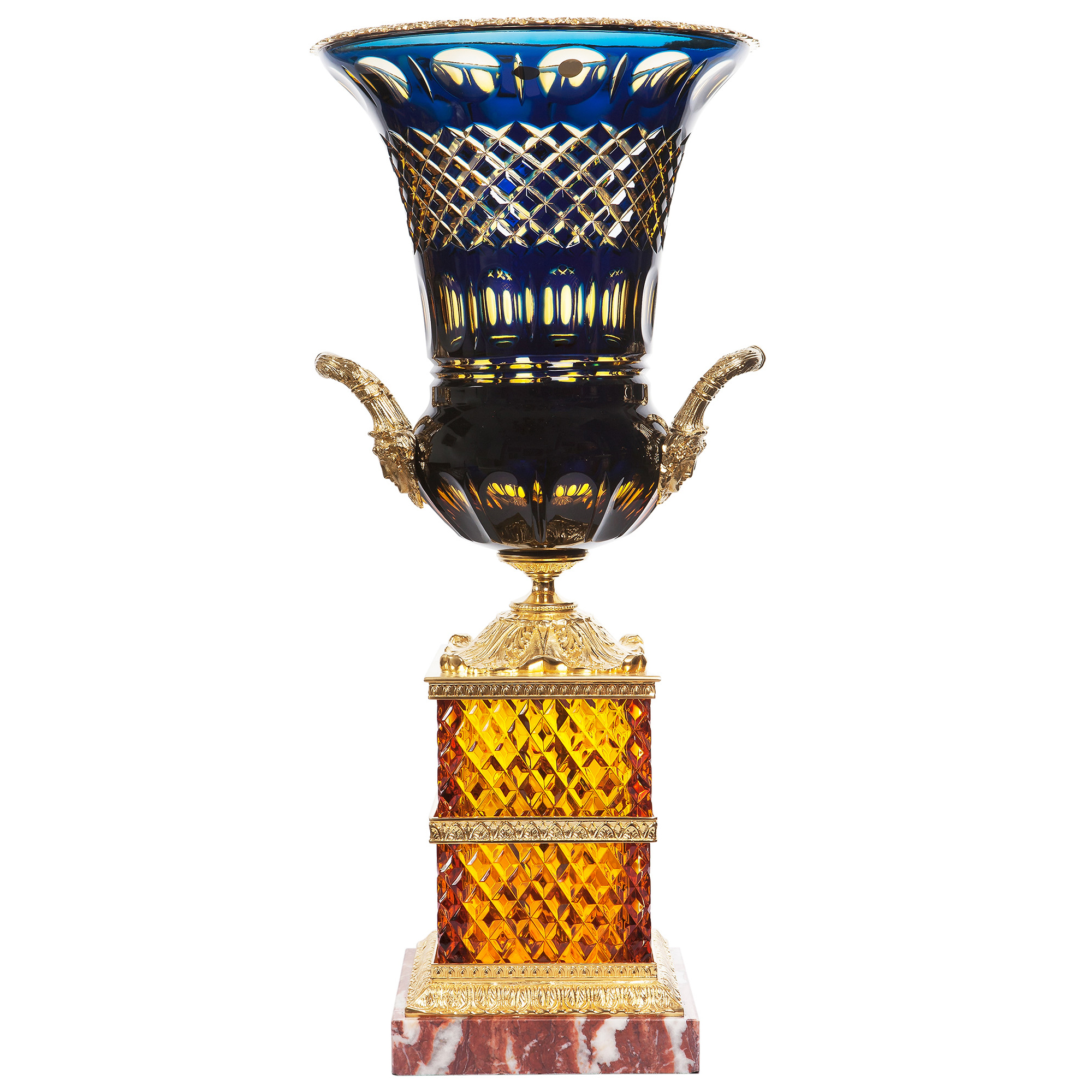 Изумительный синий хрусталь верхней части, словно ночное небо над куполами соборов, пронзенный золотистыми бликами свечей, мерцает в глубине своей огранки. Изящные бронзовые ручки, подобные крыльям мифических существ, добавляют образу изысканной грации, а плавные линии основания будто отсылают к римским вазонам, украшавшим дворцы императоров.