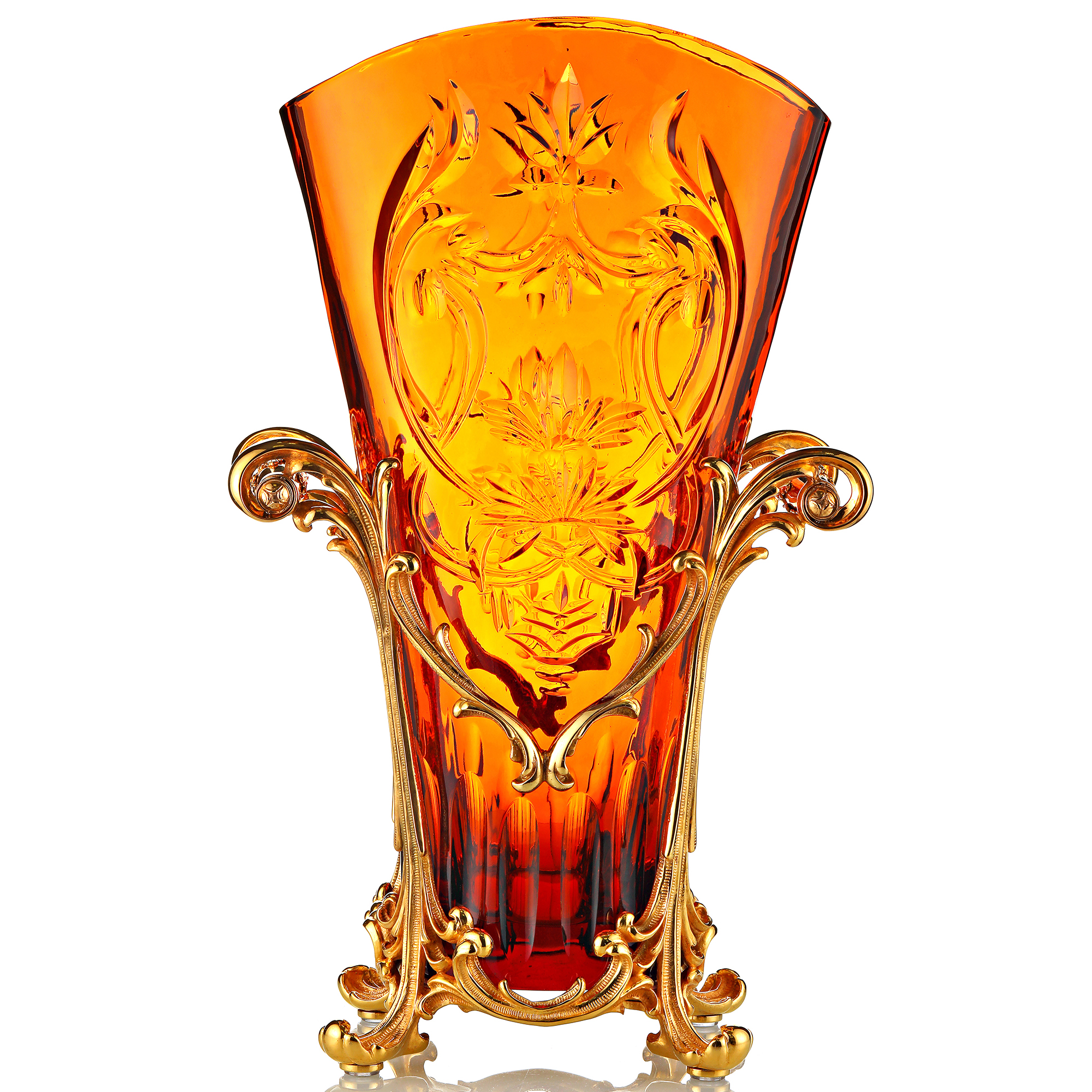 Торжественная, словно фанфары королевского двора, и величественная, как рассвет над городами эпохи Возрождения, высокая хрустальная ваза являет собой гимн совершенству. Янтарный свет, заключенный в гранях благородного хрусталя, играет, преломляясь в тончайшей огранке, оживляя пространство лучами золотистого сияния.