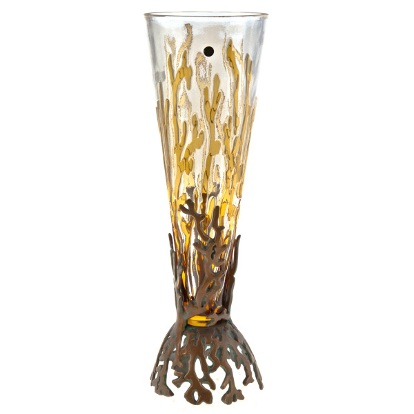 Основание выполнено в виде сложной металлической структуры, стилизованной под разветвлённый коралл. Пластичный, рельефный металл с патинированной поверхностью напоминает архаичные подводные скульптуры, обросшие веками морской жизни. Контраст между хрупкой прозрачностью стекла и суровой прочностью основания создаёт эффект внутреннего напряжения, как в живой природе, где красота и мощь сливаются в едином организме. Работа с металлом выполнена с ювелирной точностью: каждая ветвь уникальна, каждый изгиб наполнен движением.