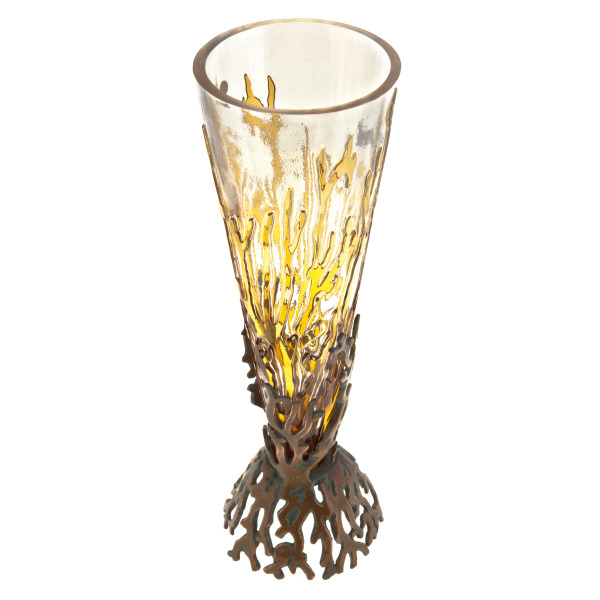 Ваза "Коралл" — это смелый диалог между природой и современным искусством, воплощённый в стекле и металле. Высокая форма, устремлённая вверх, словно повторяет ритм морских течений или движение подводных водорослей, вытягивающихся к свету. Тело вазы изготовлено из полупрозрачного стекла с мягкими переливами янтарного цвета, напоминающего солнечные блики на поверхности воды. Фактура стекла будто оживает: жёлтые прожилки устремляются вверх, как языки пламени или коралловые ветви, рождая ощущение живого дыхания внутри предмета.