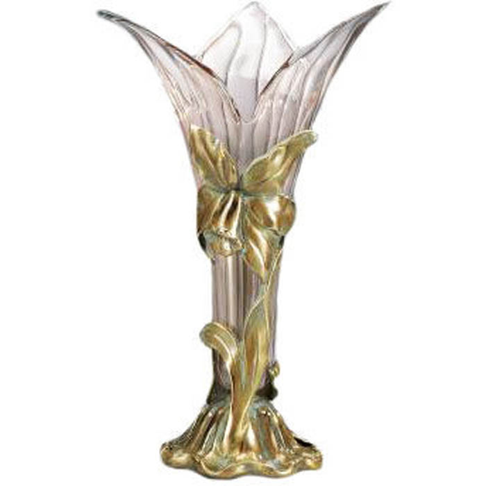 Основу изделия составляет прочное прозрачное стекло, органично переходящее в изящные лепестки, формирующие верхний край сосуда. Особую уникальность придаёт позолоченный декоративный элемент в виде цветка нарцисса с листьями, искусно обвивающими тело вазы. Золочёная отделка выполнена с тщательным вниманием к деталям, благодаря чему поверхность словно оживает, отражая игру света и создавая благородный блеск. Такое сочетание материалов и мастерства демонстрирует высокое качество исполнения и подчёркивает статус владельца.