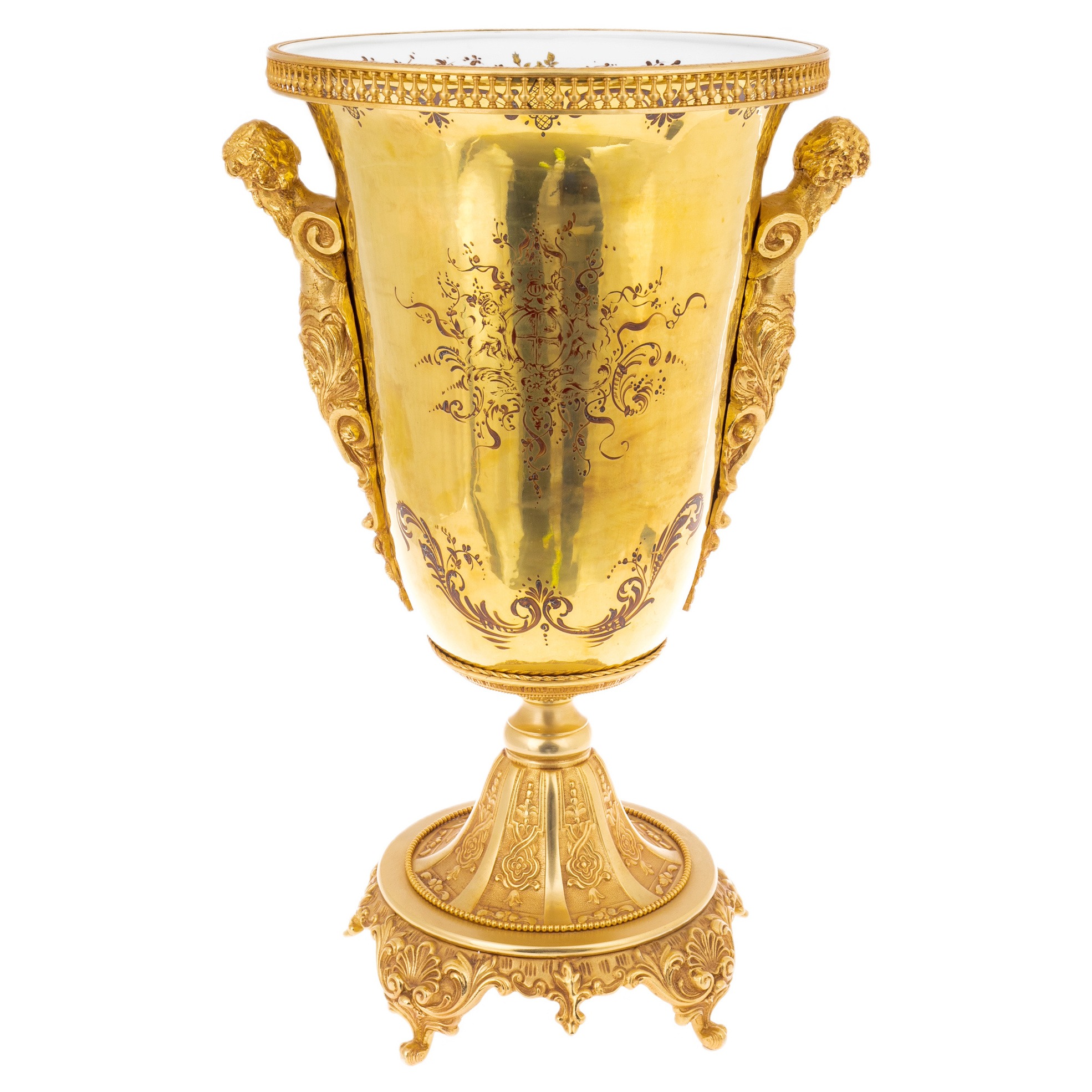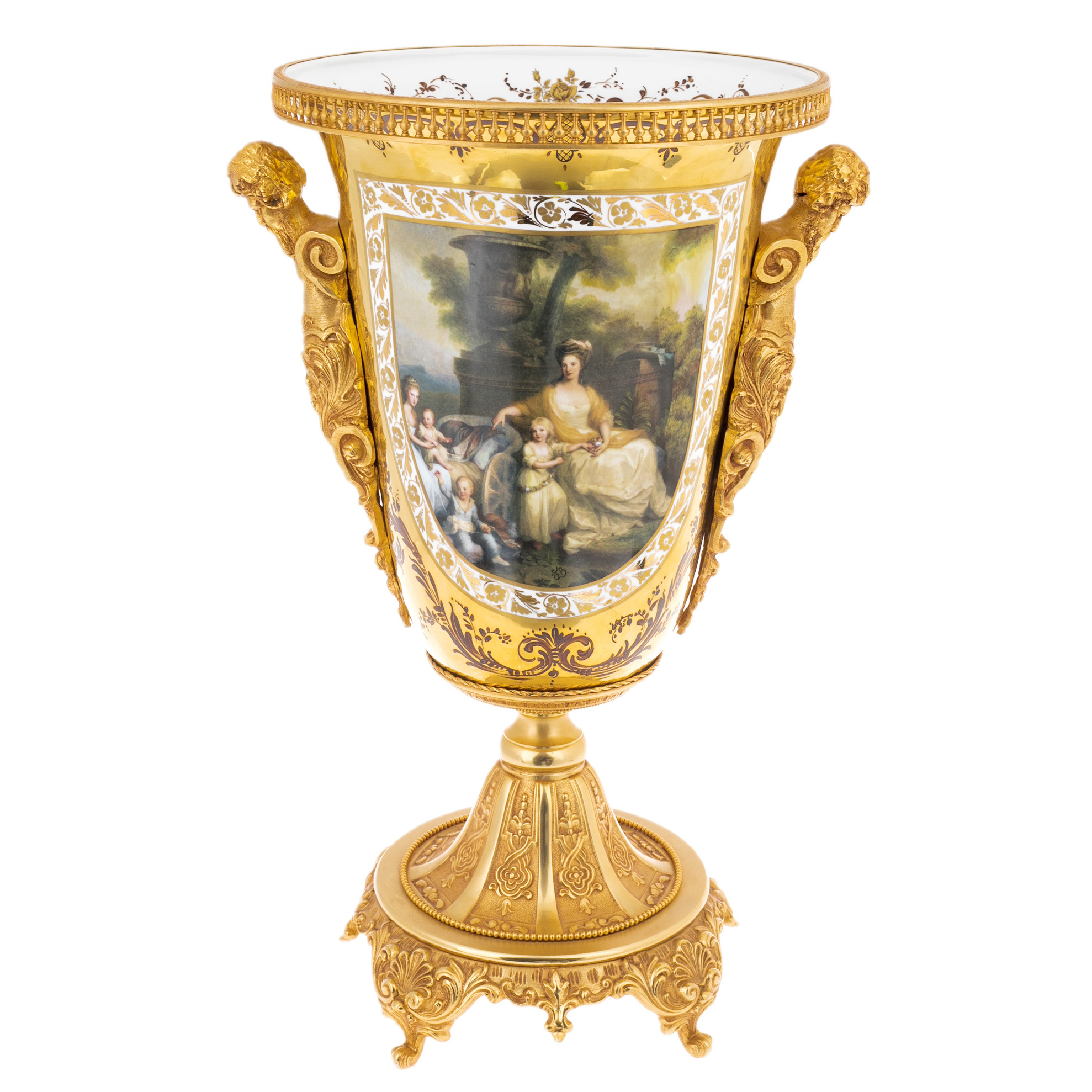 Каждый взгляд на эту вазу переносит в эпоху роскоши и благородства, где изысканные декоры и сцены на поверхности фарфора рассказывают свои истории, полные величия и элегантности. Позолота и рельефы подчеркивают статус этой вазы как произведения искусства, которое будет уместно как в частной коллекции, так и в парадных залах, вызывая восхищение и уважение всех, кто удостоится ее увидеть.