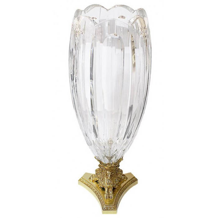 Цоколь вазы украшен литым орнаментом с позолотой, отсылающим к французскому классицизму: головы баранов, стилизованные аканты и архитектурная основа с чеканными деталями создают прочный визуальный фундамент для хрупкого тела. Этот контраст подчёркивает замысел мастера: соединение эфемерности стекла и вечности металла, изящества и силы. Всё оформление выдержано в строгости геометрии и орнаментальной точности, что превращает предмет в универсальный элемент как для строгих интерьеров, так и для исторических пространств с акцентом на детали.