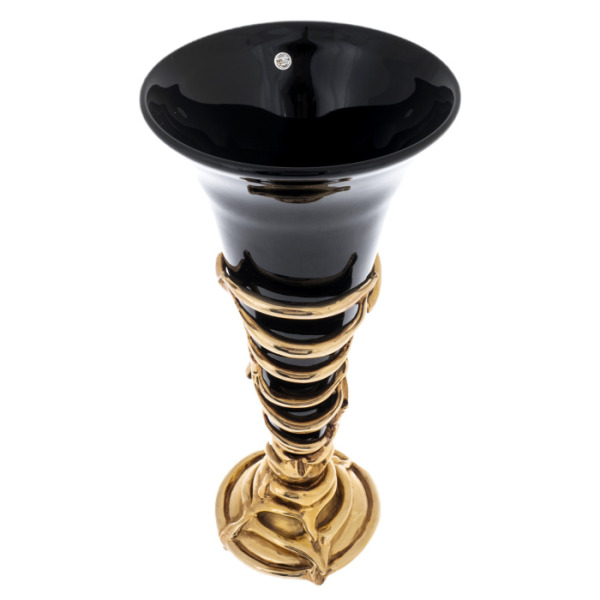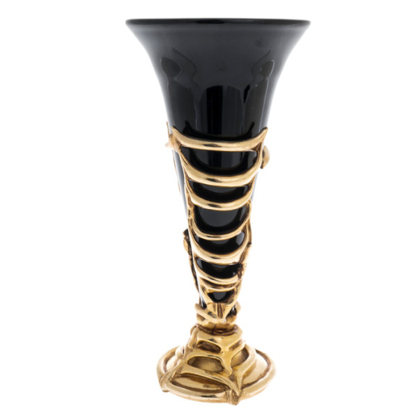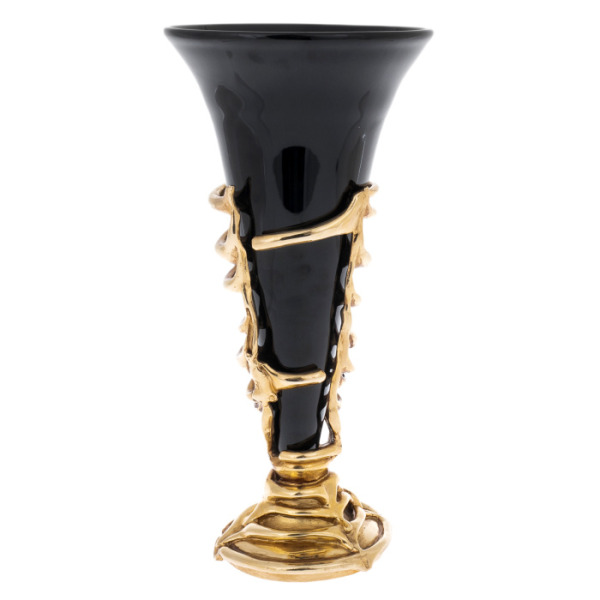 Особую пластичность форме придаёт бронзовая композиция, охватывающая основание и поднимающаяся по корпусу в виде ветви плюща. Лепка листвы выполнена вручную: каждая жила, изгиб, прожилка точно воспроизводит живую структуру. Позолоченная патина бронзы сочетается с тёмной поверхностью стекла, усиливая образ контраста — света и тени, металла и стекла, статики и жизни. Овальная ножка украшена золотыми листьями, создавая прочную и вместе с тем поэтичную основу для всей конструкции.