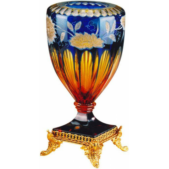 Фантастическая по цвету и форме, эта ваза выполнена из муранского стекла, в котором огонь, свет и цвет сплетаются в единую симфонию. Оттенки пламени — янтарь, гранат, кармин — восходят снизу к небесно-синему куполу, обогащённому роскошной гравировкой и рельефной живописью. Цветы, словно вышитые золотом, распускаются на темно-синем фоне, отражая свет с мягким внутренним свечением. Гладкая поверхность играет бликами, подчёркивая глубину цвета и многослойность стекла, вытянутого вручную и прошедшего полировку до совершенного блеска.