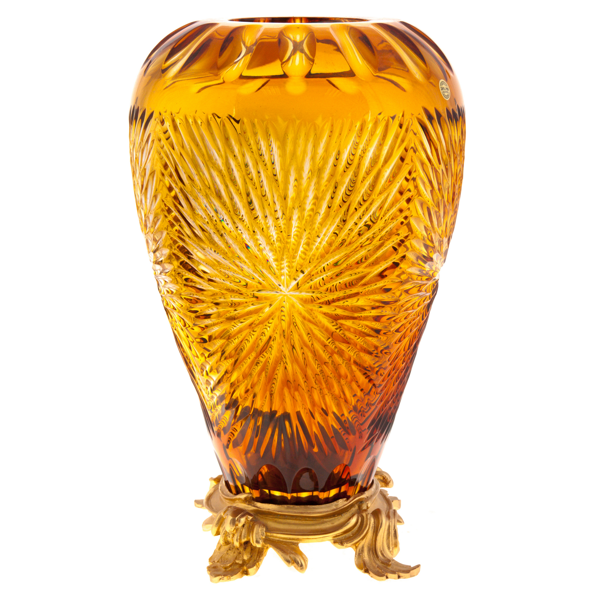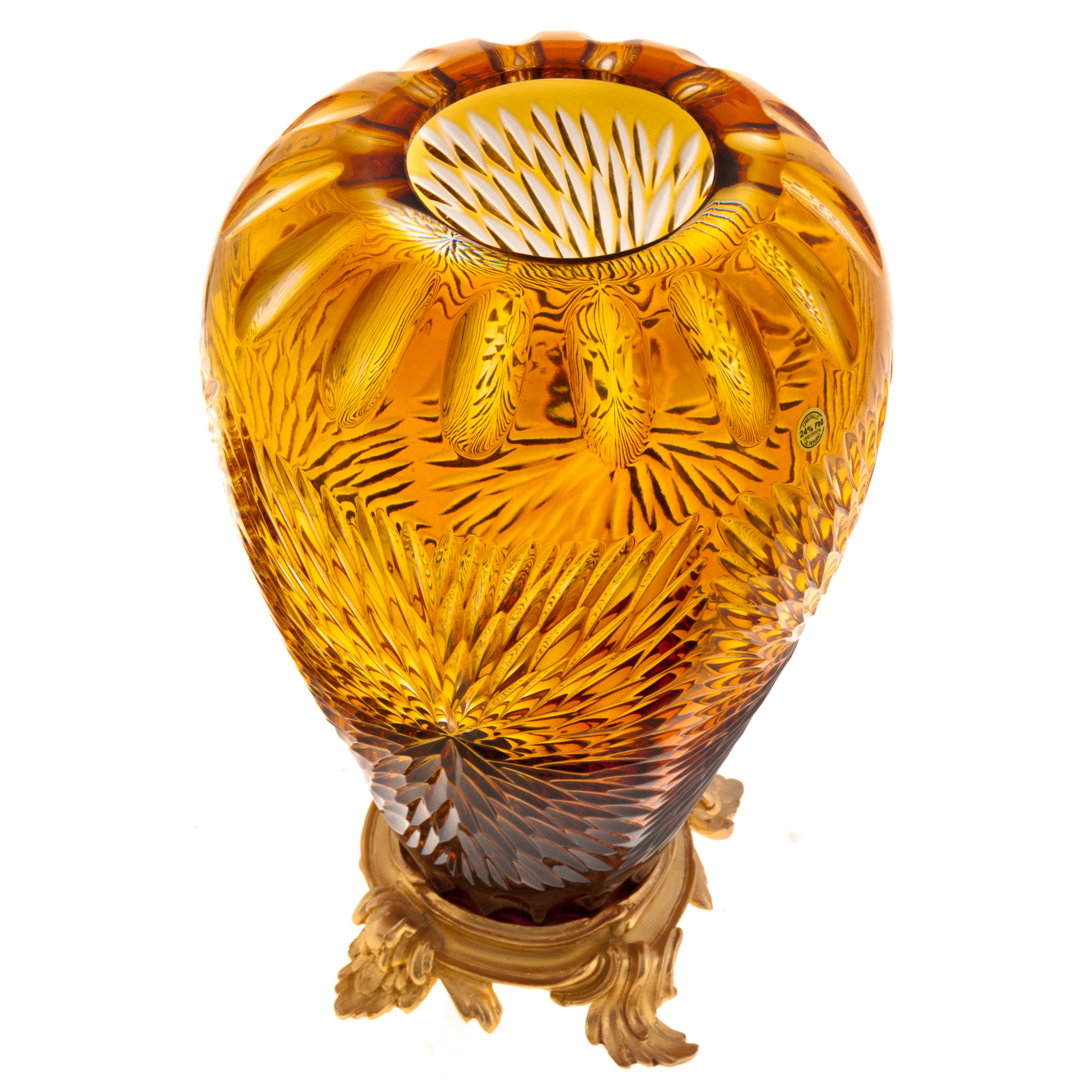Ваза венчается подставкой из золочёной бронзы, отлитой с барочной щедростью: листья аканта, изогнутые ножки, скульптурные завитки — всё это усиливает декоративность предмета, подчёркивая его коллекционный характер. Тяжесть основания уравновешивает визуальную лёгкость стеклянного корпуса, придавая композиции устойчивость и завершённость. Мягкий градиент цвета, от насыщенного янтаря внизу до почти солнечного сияния в верхней части, делает предмет живым и изменчивым — он ловит свет и передаёт его в интерьер, словно лампа без огня.