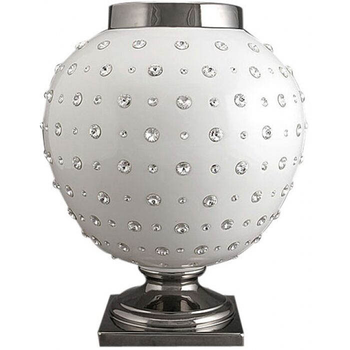 Настольная ваза «Сфера» — воплощение современного шика в чистом, геометрически выверенном объёме. Абсолютно симметричная форма шара создаёт ощущение идеального баланса, а глянцевая белая поверхность наполняет композицию светом и простором. Вся её поверхность усыпана сверкающими кристаллами, подобно звёздам на снежной планете, — каждый камень преломляет свет по-своему, создавая игру бликов и глубины. Контраст между сияющей белизной и металлическим основанием подчёркивает статус предмета как арт-объекта, а не просто вазы для цветов.