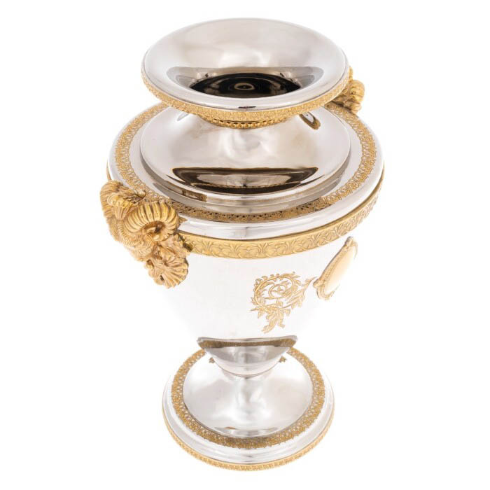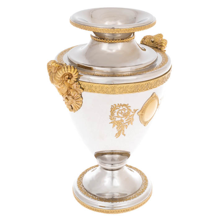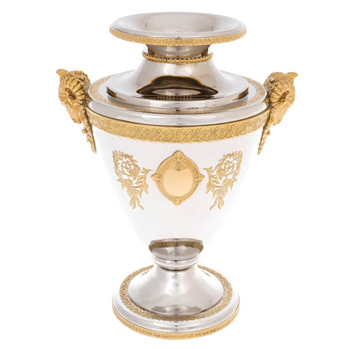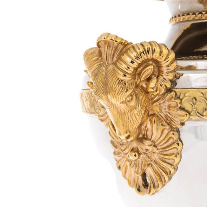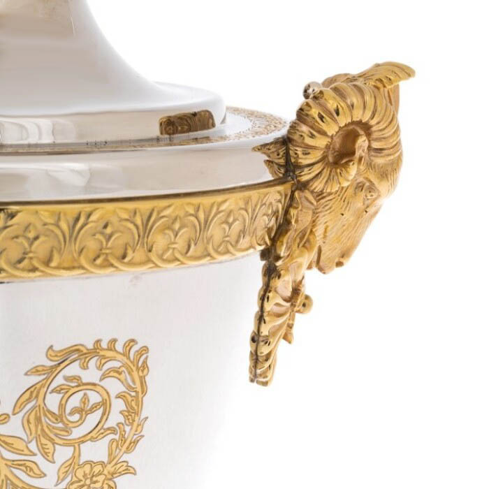 Головы архаров, гордо возвышающиеся на боках вазы, олицетворяют непоколебимость и силу. Они будто хранители, впитавшие дух дикой природы, её выносливость и свободу. Эти золочёные образы, выточенные с анатомической точностью, символизируют непреодолимую волю к победе и гордость, достойную истинного лидера.