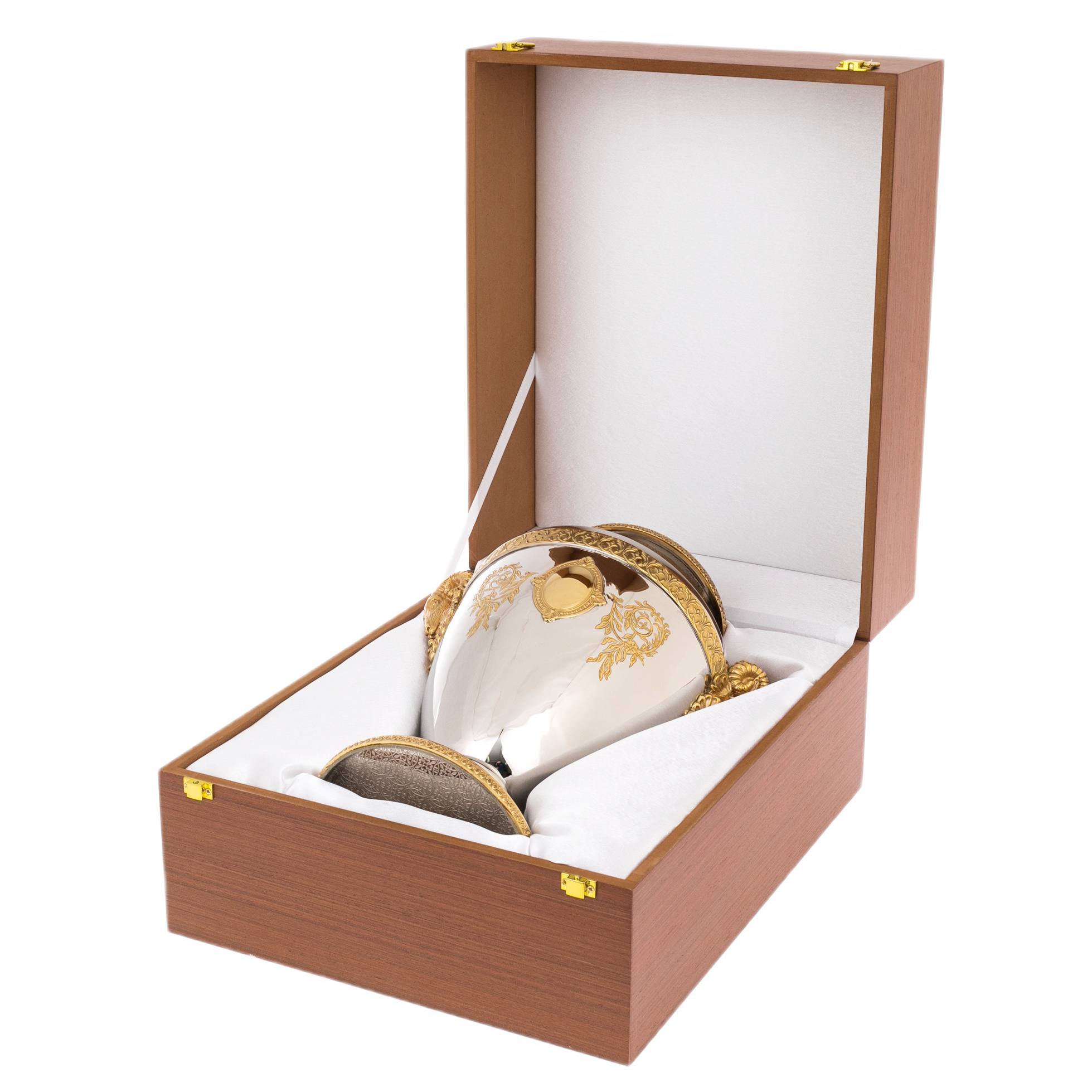 Эта ваза — не просто предмет интерьера, но торжественная ода величию и грации. Её блестящий корпус из никелированной латуни словно гладь горного озера, отражающая солнечные лучи и обрамлённая сияющими золотыми берегами. Каждая деталь здесь — как строчка в эпосе, рассказывающем о гармонии искусства и природы.