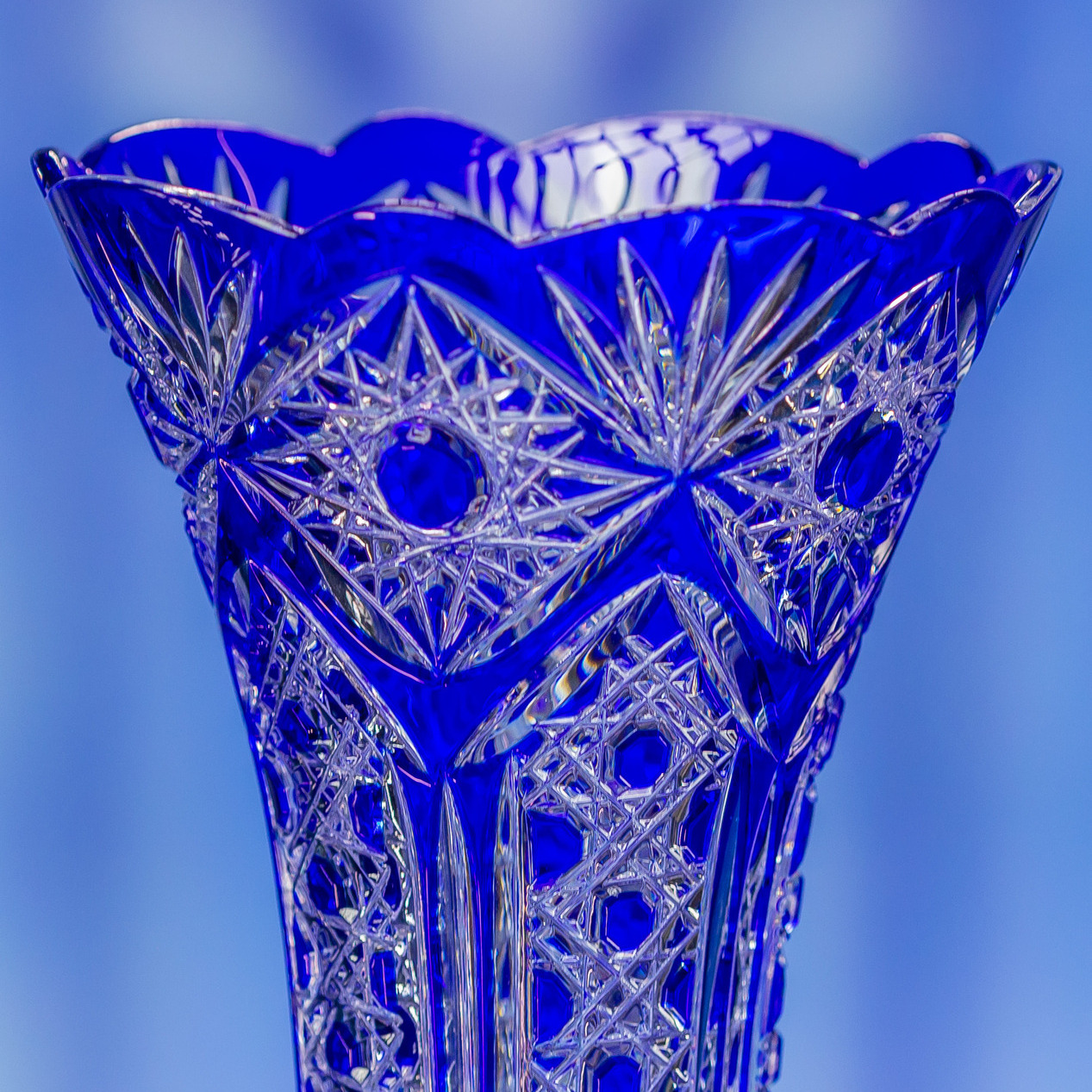 Ваза изготовлена из благородного хрусталя, украшенного сложнейшей резьбой. Мастерство златоустовских художников проявляется в каждой грани этого изящного шедевра. Хрусталь здесь не просто материал – это отражение света и тени, которые танцуют на его поверхности, создавая игру бликов и глубину, подобную сиянию драгоценных камней. Резьба по хрусталю создает ощущение движения, напоминая звезды, запечатленные в застывшем мгновении.