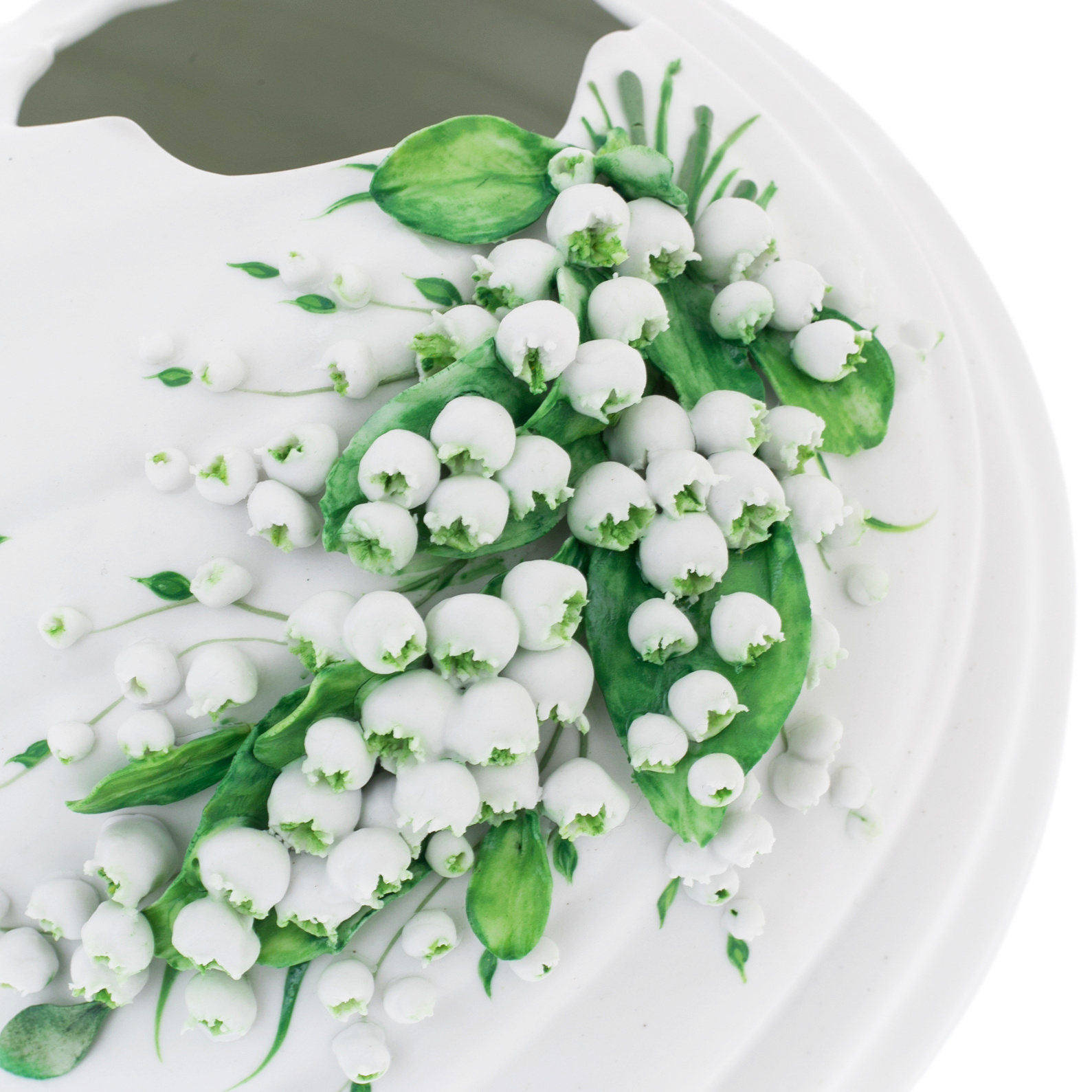 Рельефный орнамент с ландышами, декорированный вручную, напоминает о хрупкости и красоте мгновений, которые так ценны. Сочные зеленые листья обрамляют изысканные белоснежные колокольчики, а голубая ленточка добавляет композиции легкости и нежности. В каждом элементе чувствуется гармония природы и искусства, подчеркивающая исключительность изделия.