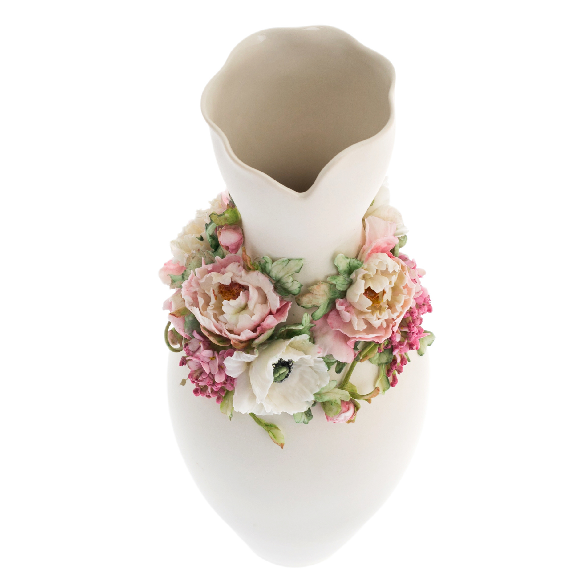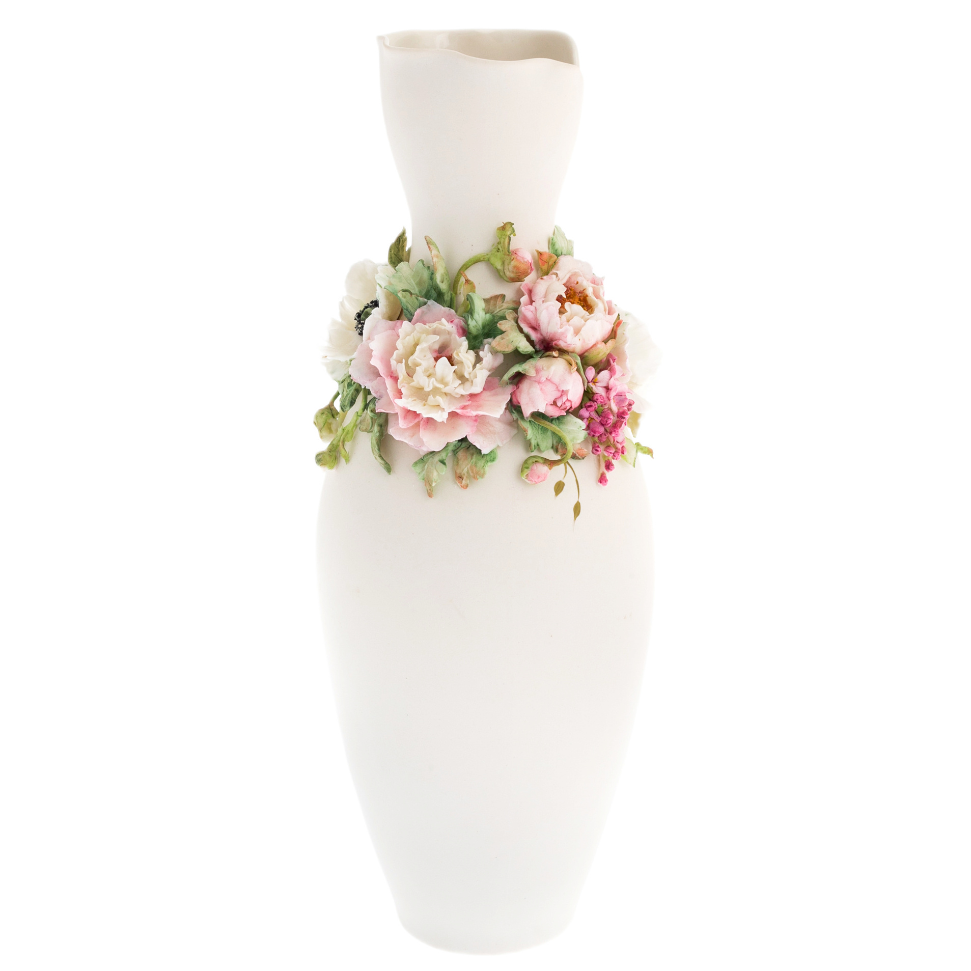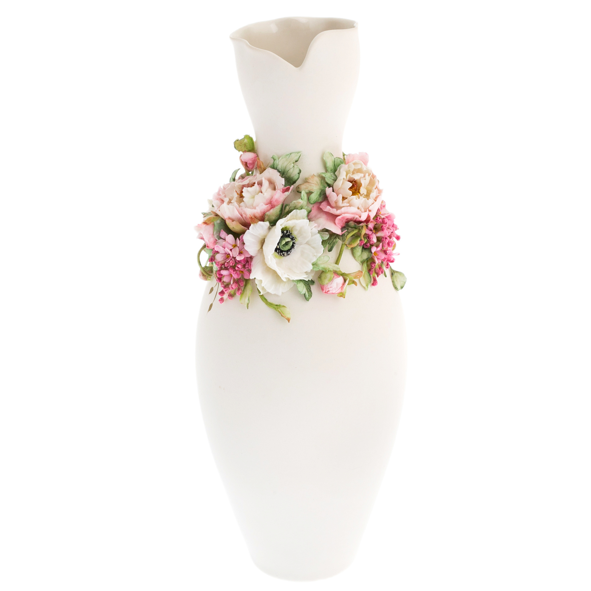 Ваза из фарфора, привезенного из Европы — ода легкости, свежести и утонченности. Ее изогнутые линии словно переносят в солнечное утро за городом, где воздух пропитан ароматами луговых цветов. Белоснежная поверхность переливается мягким сиянием, создавая идеальный фон для нежного венка из маков, ромашек и васильков, сплетенного с ювелирной точностью. Каждая лепестковая складка, каждый изгиб тончайших стеблей воплощает красоту мимолетного мгновения, заключенного в вечности.