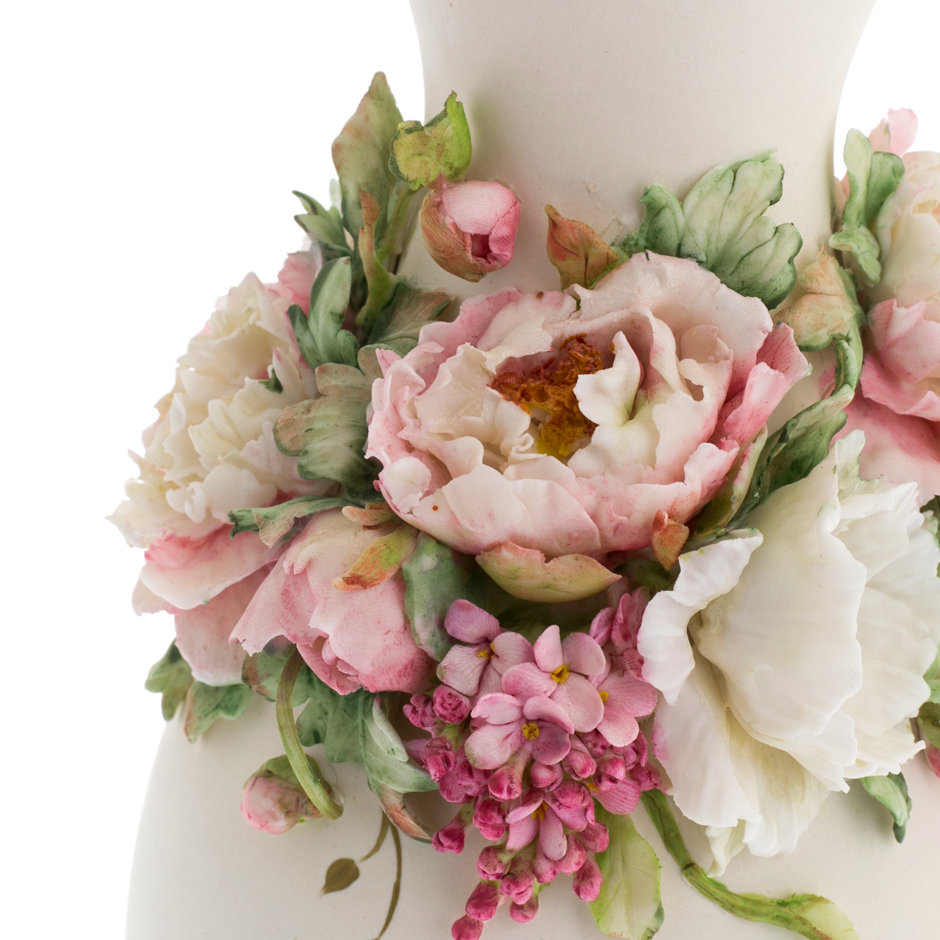 Цветочная композиция на фарфоре выглядит живой: пышные бутоны тянутся к свету, крохотные листья трепещут в невидимом дыхании ветра. В этой вазе чувствуется баланс природной стихийности и совершенства человеческого мастерства. Мастера подарили ей не просто форму, а душу, позволив сохранить ощущение цветущего луга, который не увядает.