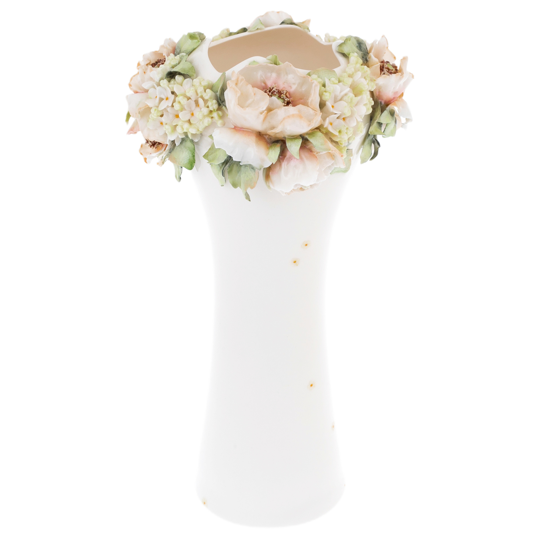 Ваза из фарфора, привезенного из Европы — ода легкости, свежести и утонченности. Ее изогнутые линии словно переносят в солнечное утро за городом, где воздух пропитан ароматами луговых цветов. Белоснежная поверхность переливается мягким сиянием, создавая идеальный фон для нежного венка из маков, ромашек и васильков, сплетенного с ювелирной точностью. Каждая лепестковая складка, каждый изгиб тончайших стеблей воплощает красоту мимолетного мгновения, заключенного в вечности.
