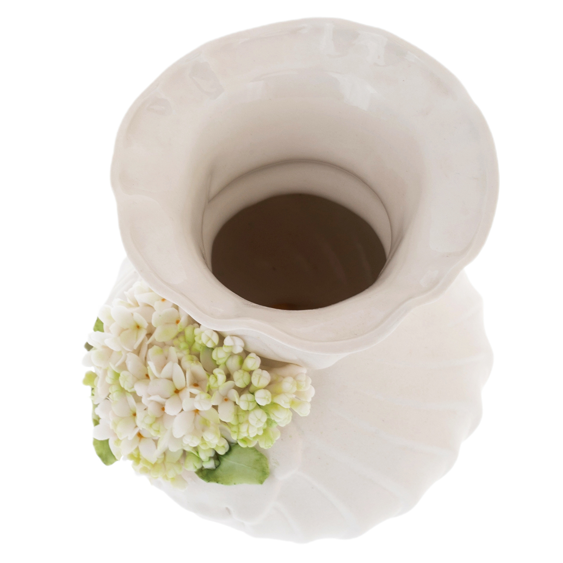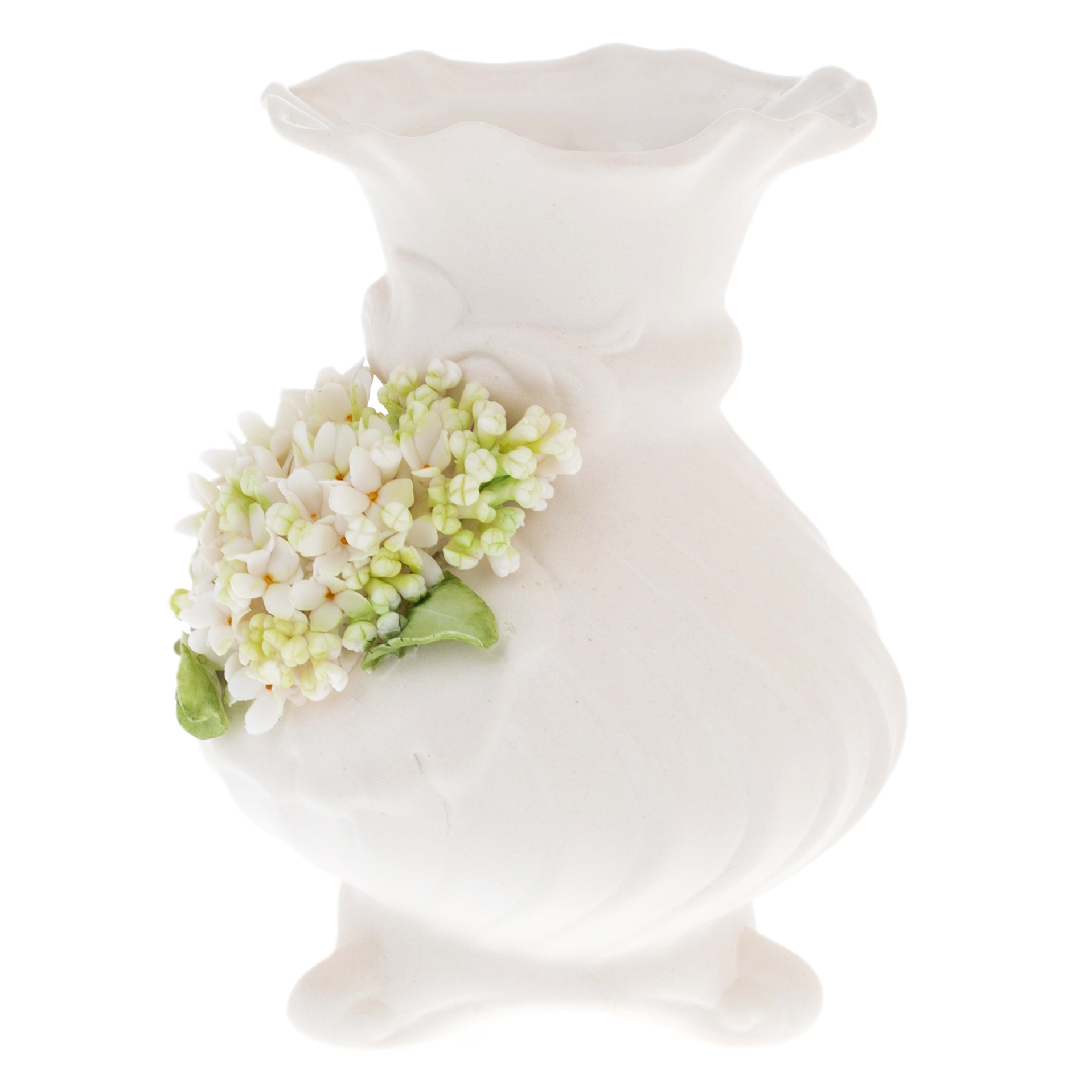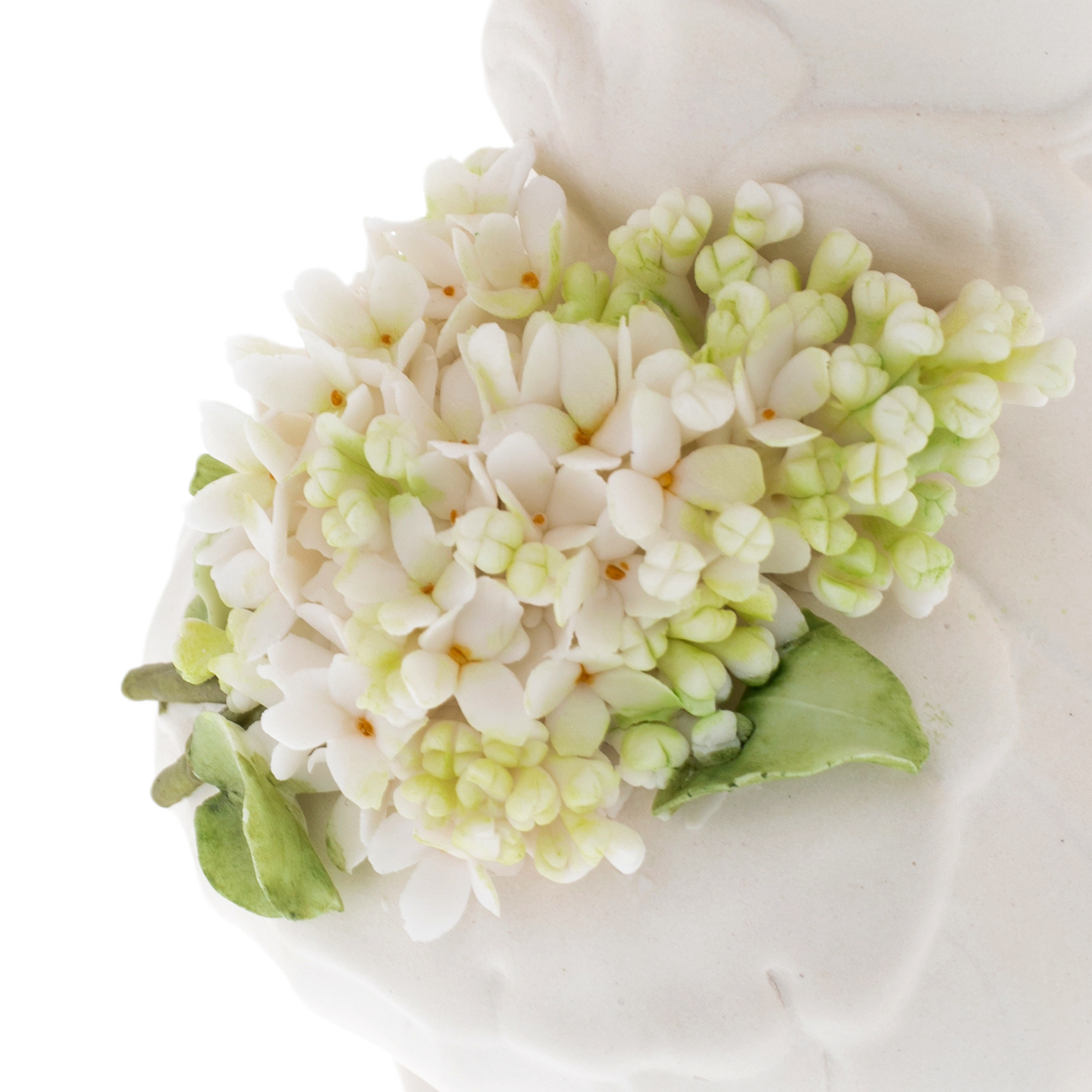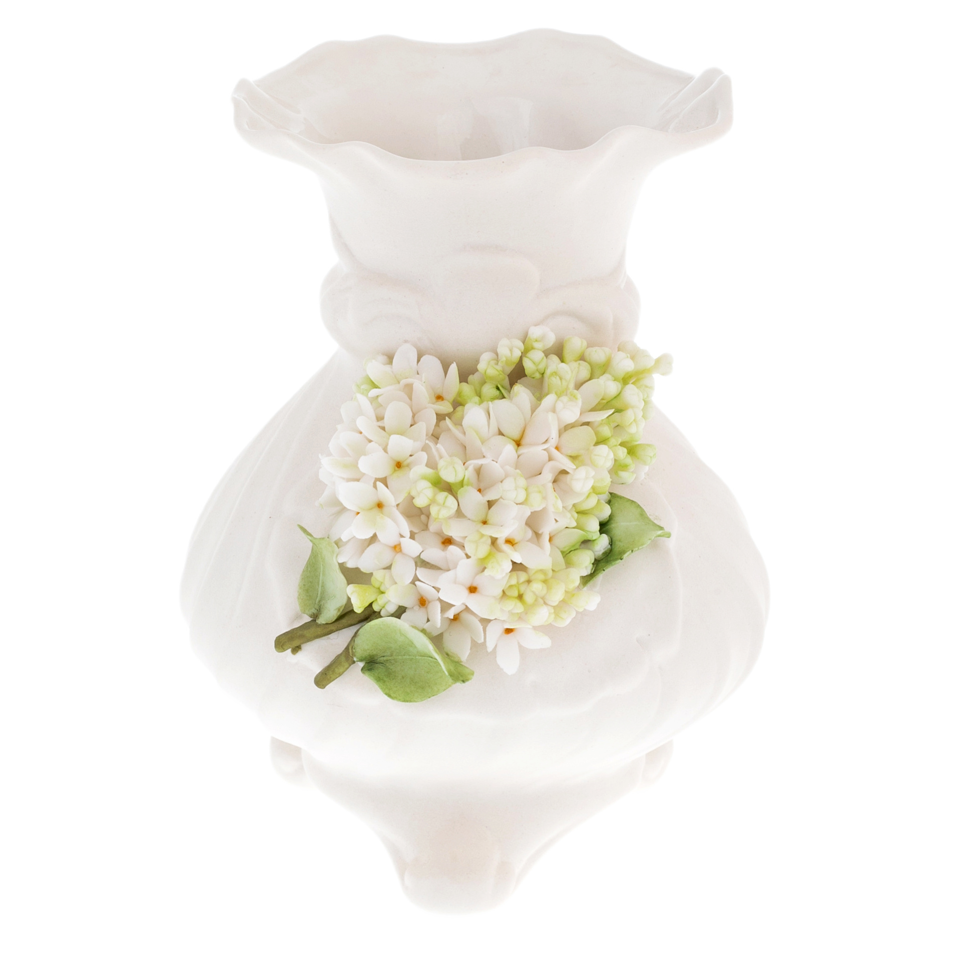 Ваза из фарфора, привезенного из Европы — воплощение эфемерной красоты весны, заключенной в белоснежные изгибы благородного материала. Ее силуэт напоминает изящное движение шелкового платья, развевающегося в утреннем бризе. На ее поверхности — утонченный рельеф, подобный легкому дыханию времени, застывшему в совершенной форме. Объемная ветвь сирени, выполненная вручную, кажется живой: полураскрытые бутоны, тонкие лепестки, оттененные каплями зелени, словно пропитаны ароматом раннего мая.