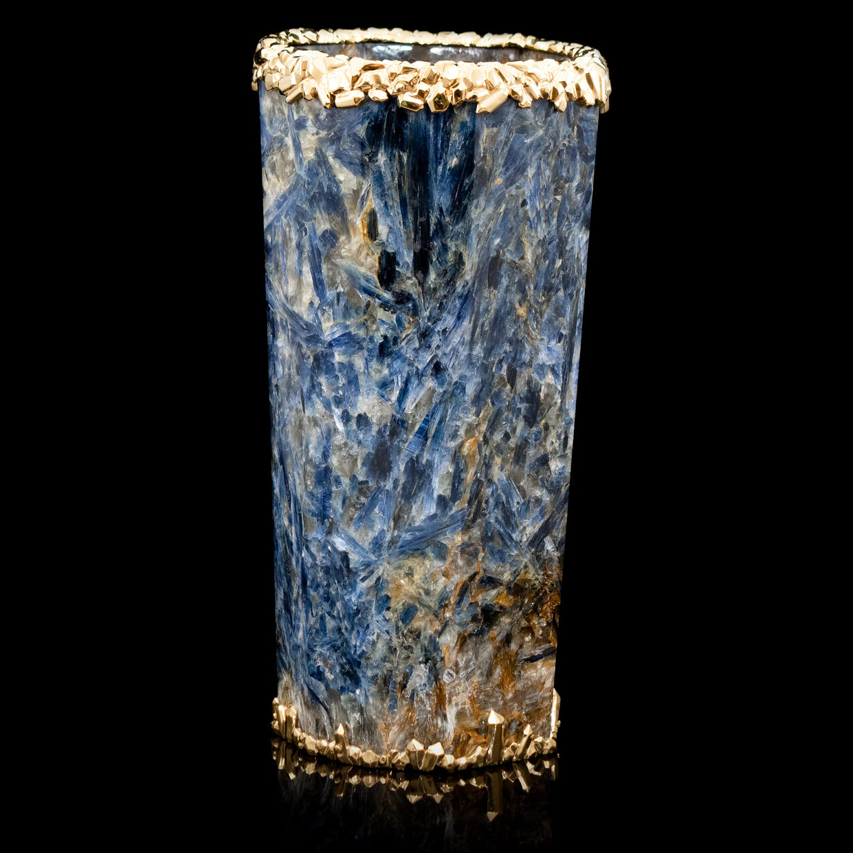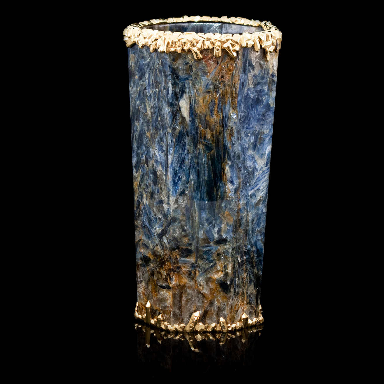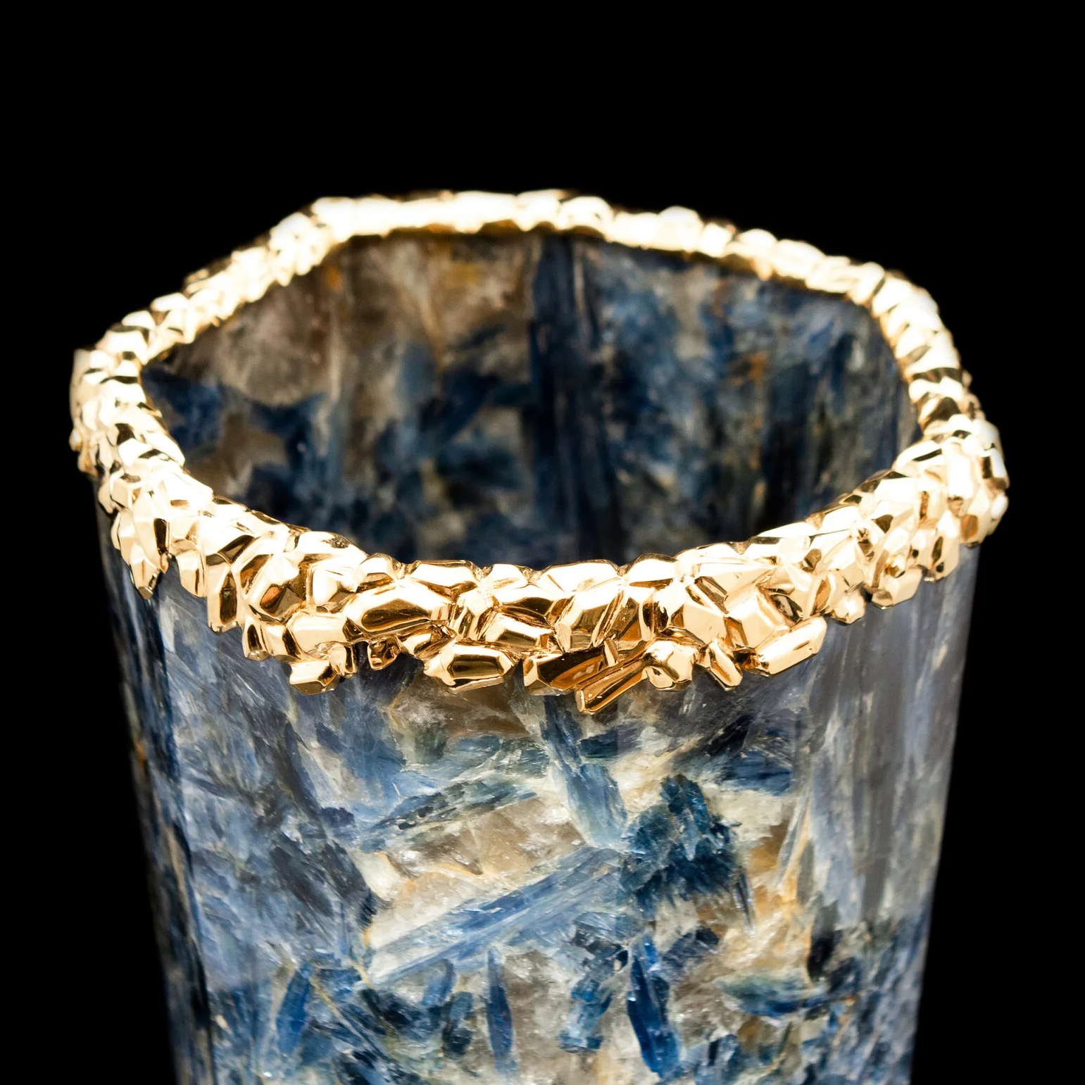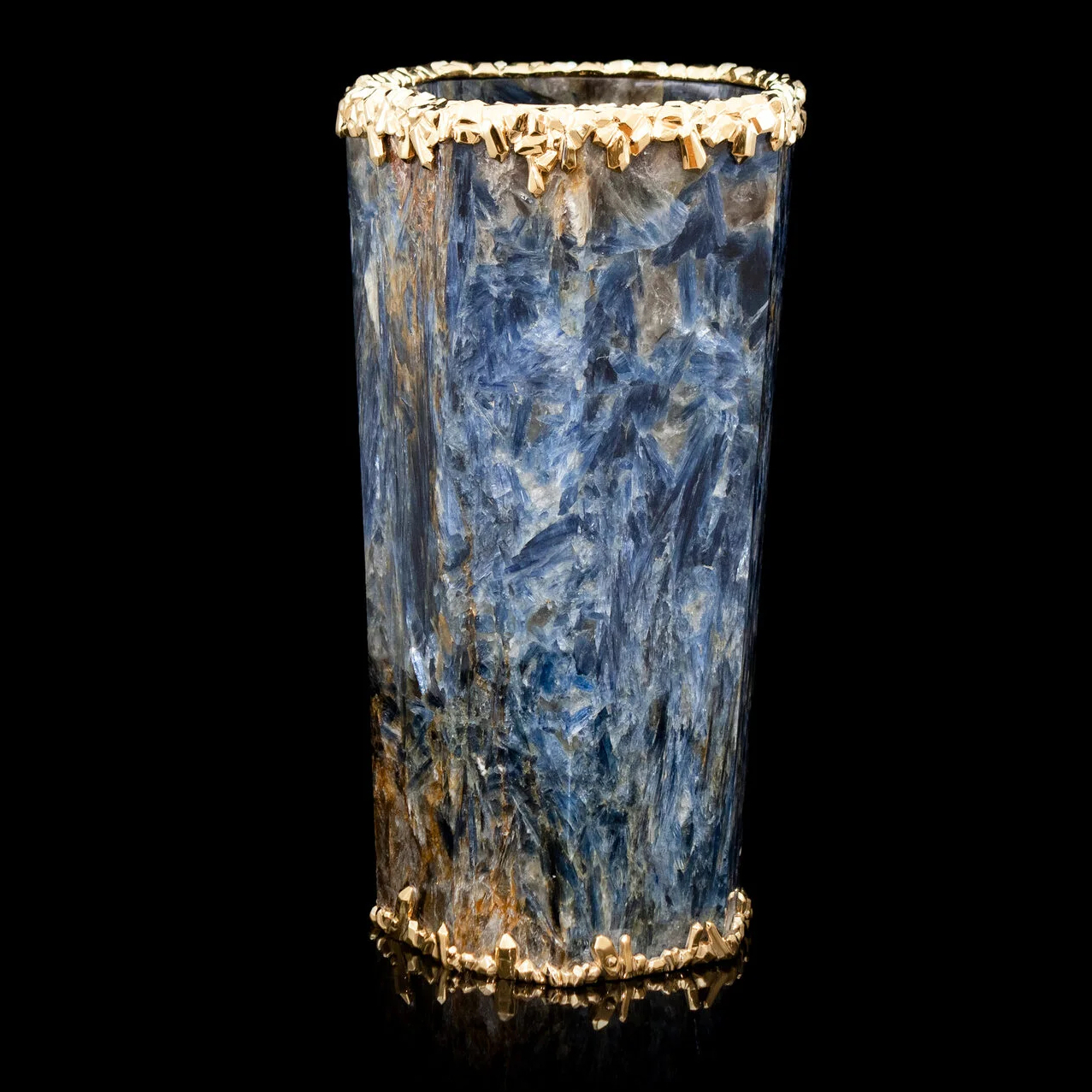 Уникальная ваза из редчайшего ювелирного кианита, украшенная вставками из серебра 925 пробы с покрытием золотом 24 карата. 100% ручная работа. На изготовление изделия ушло более 10 месяцев.