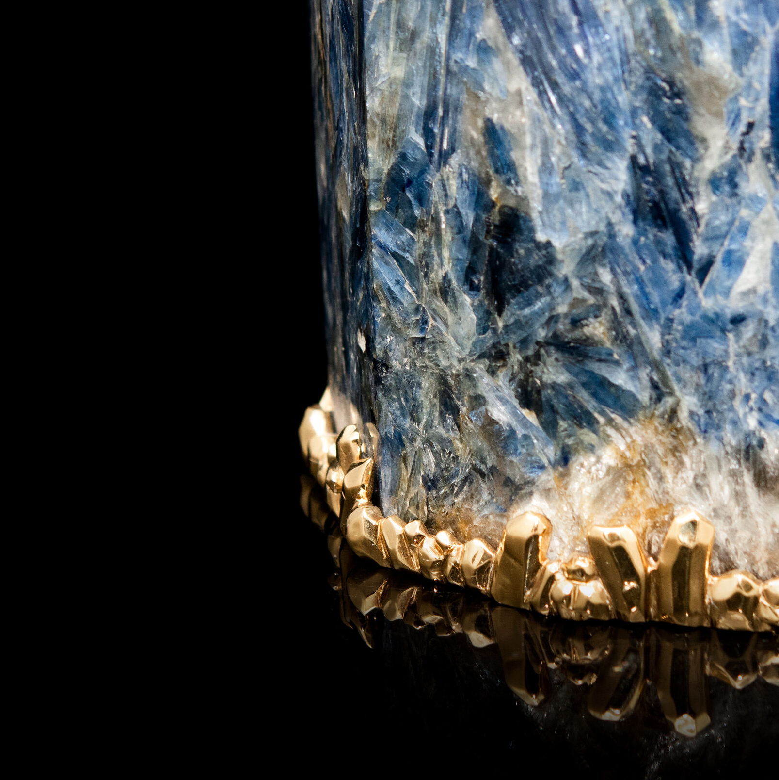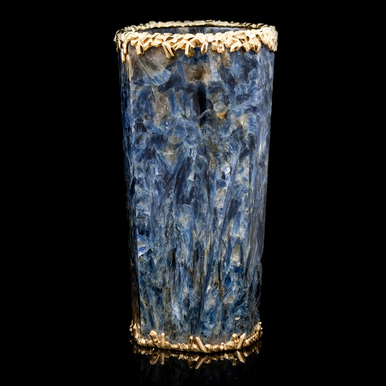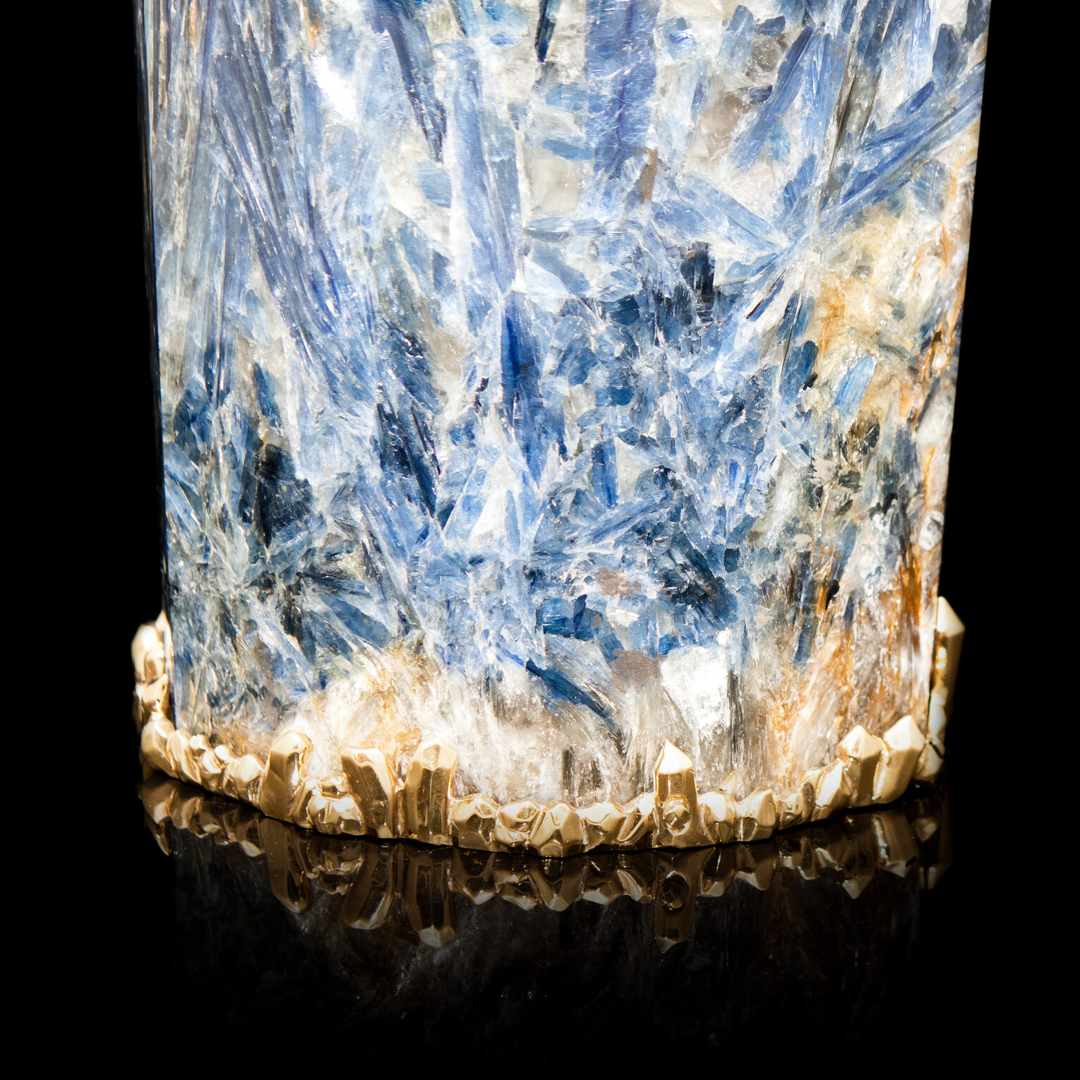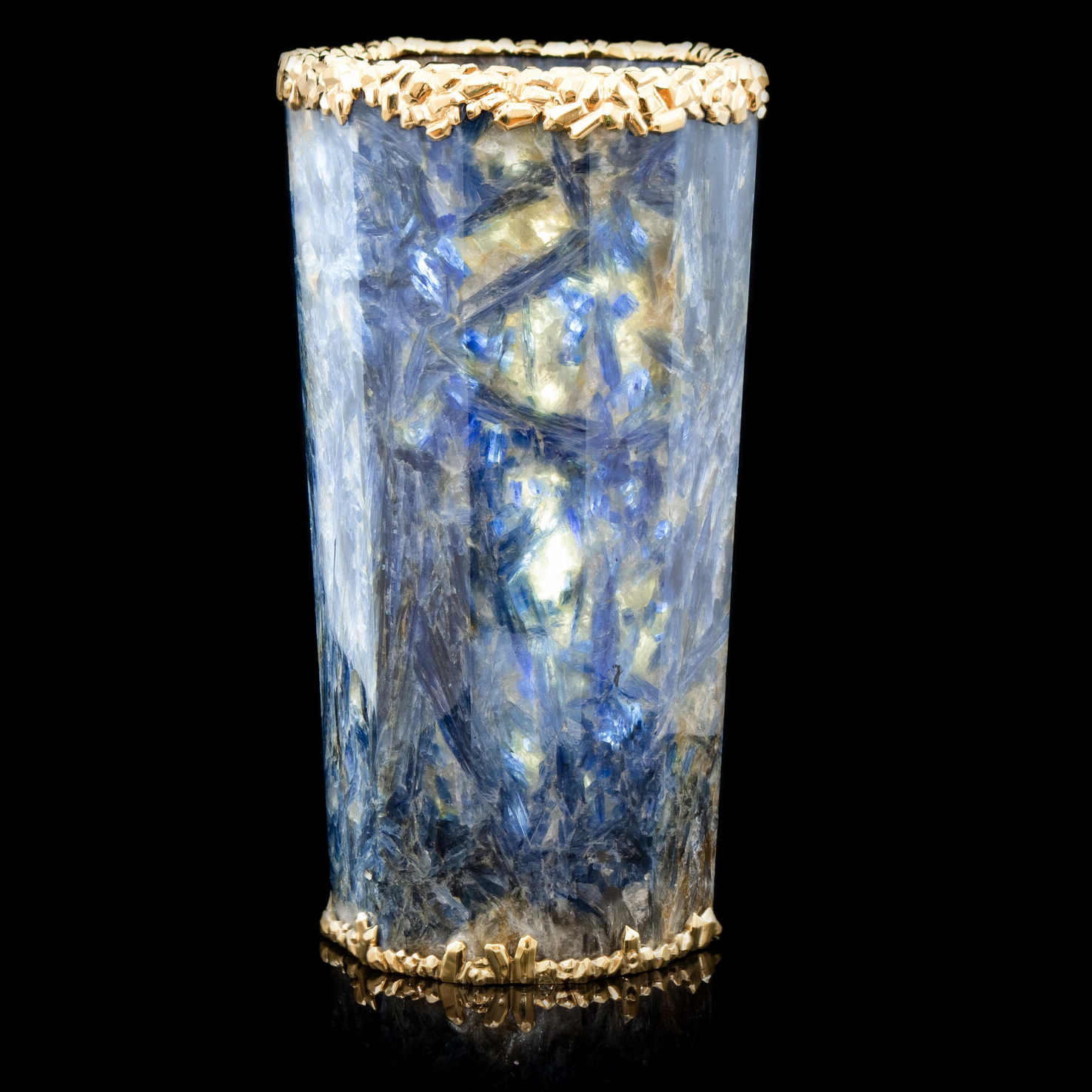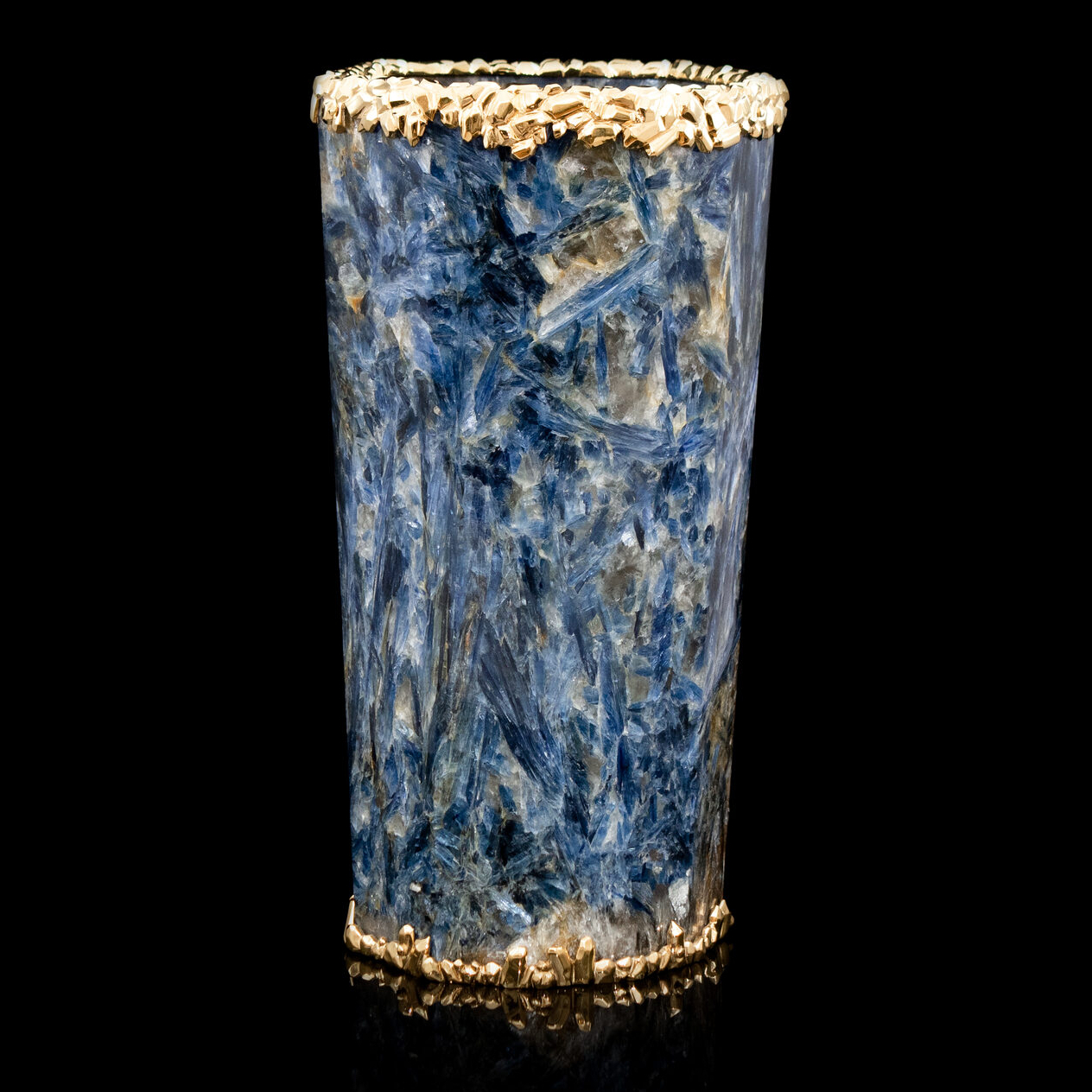Уникальная ваза из редчайшего ювелирного кианита, украшенная вставками из серебра 925 пробы с покрытием золотом 24 карата. 100% ручная работа. На изготовление изделия ушло более 10 месяцев.
