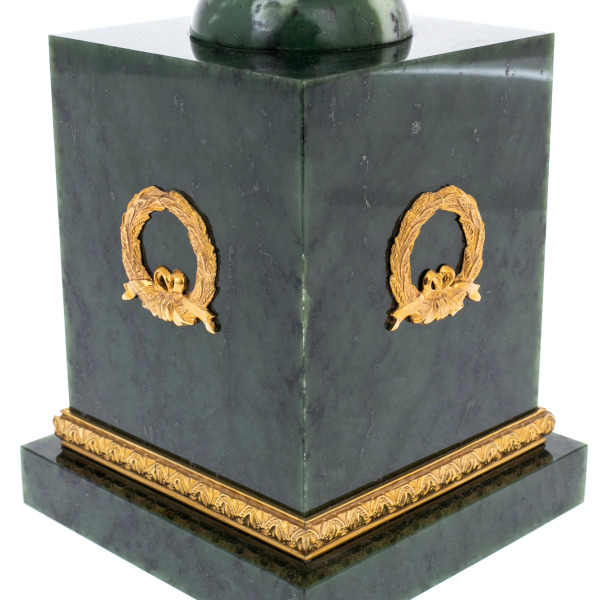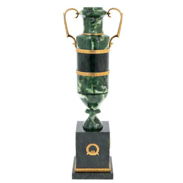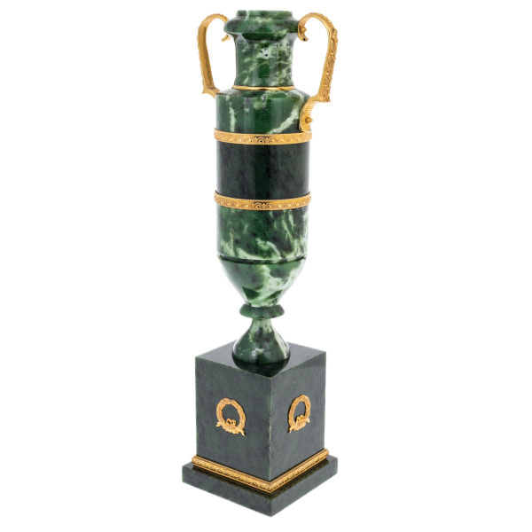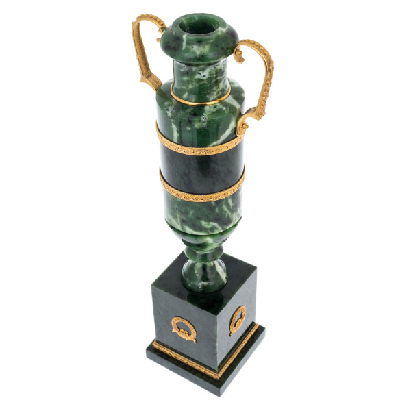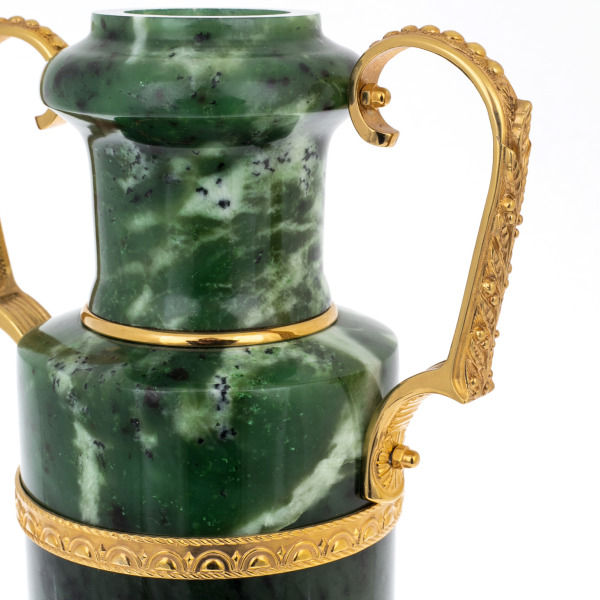 Золочёные накладки на корпусе и постаменте обрамляют камень подобно орнаментальным фризам, формируя чёткий ритм, визуально удерживающий взгляд на основных линиях вазы. Ручки, выполненные из металла с золочением и изогнутые в изящные спирали, придают предмету черты античных сосудов, создавая перекличку с эстетикой Имперского стиля. Контраст матовой глубины нефрита и блеска золотых элементов усиливает впечатление роскоши и делает поверхность вазы живой, реагирующей на свет.