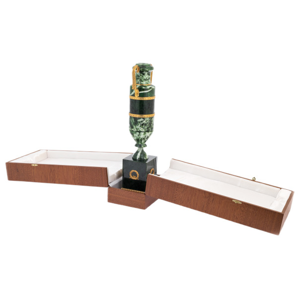 Ваза «Восточная» предназначена для тех, кто умеет чувствовать баланс между сдержанной роскошью и бесспорной ценностью. Она органично впишется в пространство, оформленное с безупречным вкусом: кабинет, библиотека, холл частной резиденции или интерьер представительского офиса. Подчёркивая индивидуальность и утончённость владельца, этот предмет говорит о стабильности, о глубинном понимании красоты, не требующей декораций. Это не ваза для цветов — это самоценный объект, живущий вне времени.