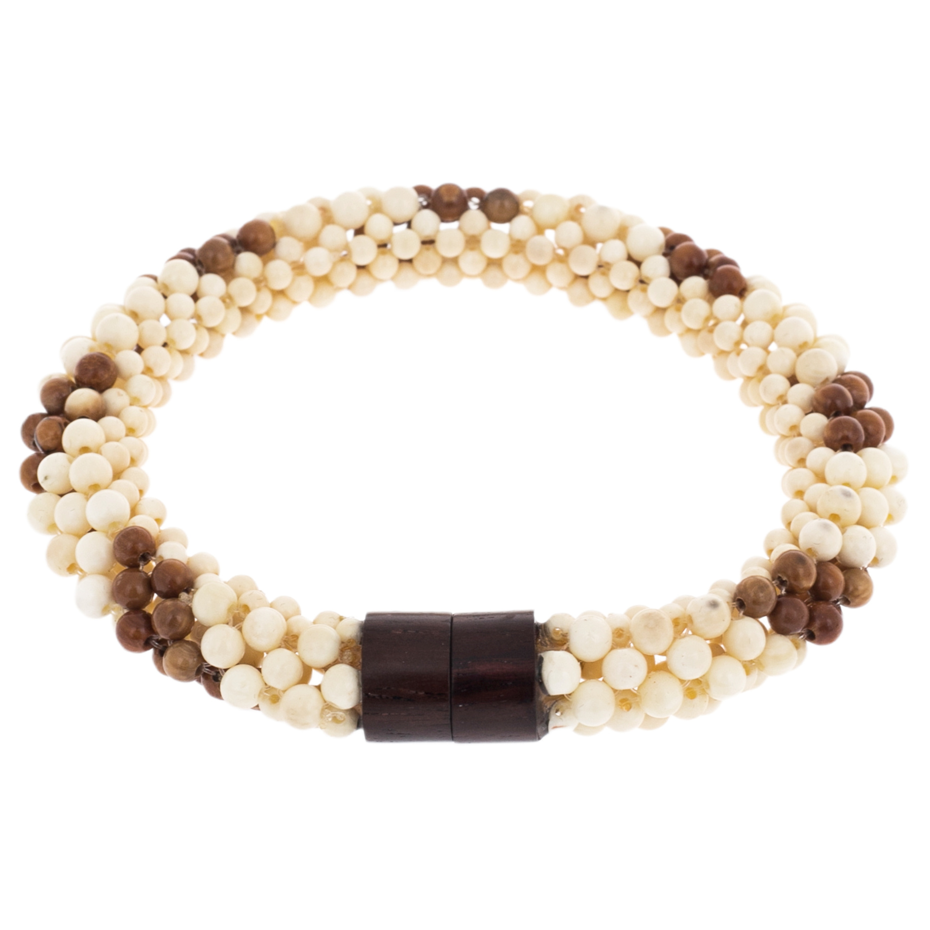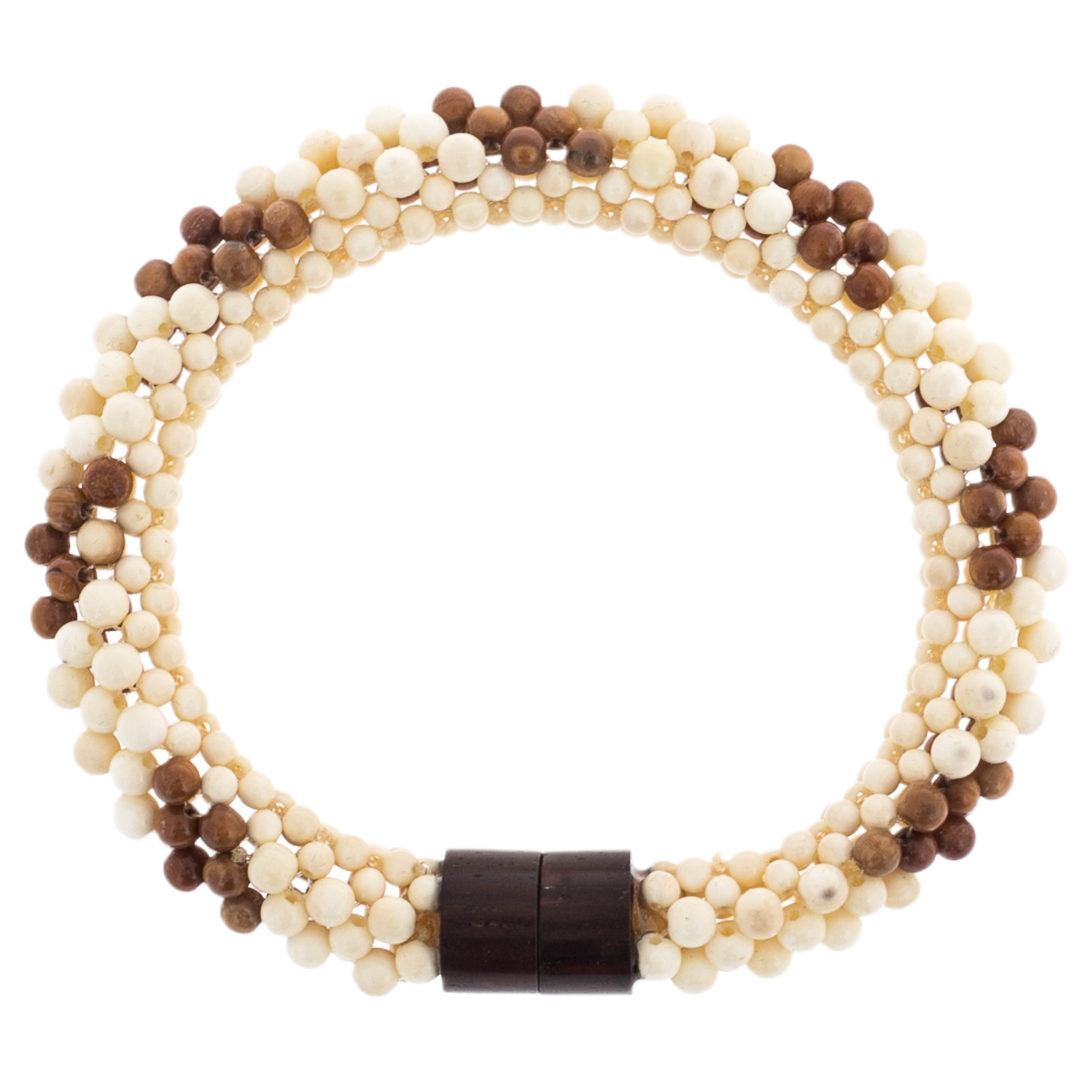 Изящный браслет, собранный из мелких бусин из бивня мамонта, плотно сплетённых в плотный виток, словно создан не руками мастера, а самой природой. Мягкие переходы цвета — от топлёного молока до глубокого орехового — формируют ненавязчивый ритм, напоминающий дыхание земли. Центральная вставка из тёмного дерева подчёркивает фактуру и глубину основного материала, добавляя графичности и выразительности всей композиции. Украшение мягко облегает запястье, будто создано для утончённого прикосновения к телу, а не просто ношения. В комплекте — коробка с восточным орнаментом, намекающая на происхождение философии, в которой скрыта сдержанная роскошь.