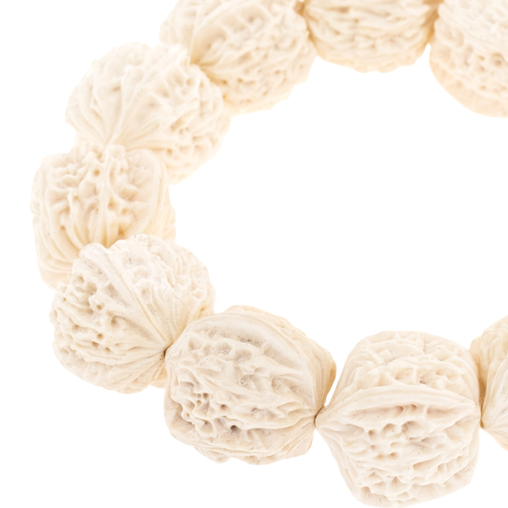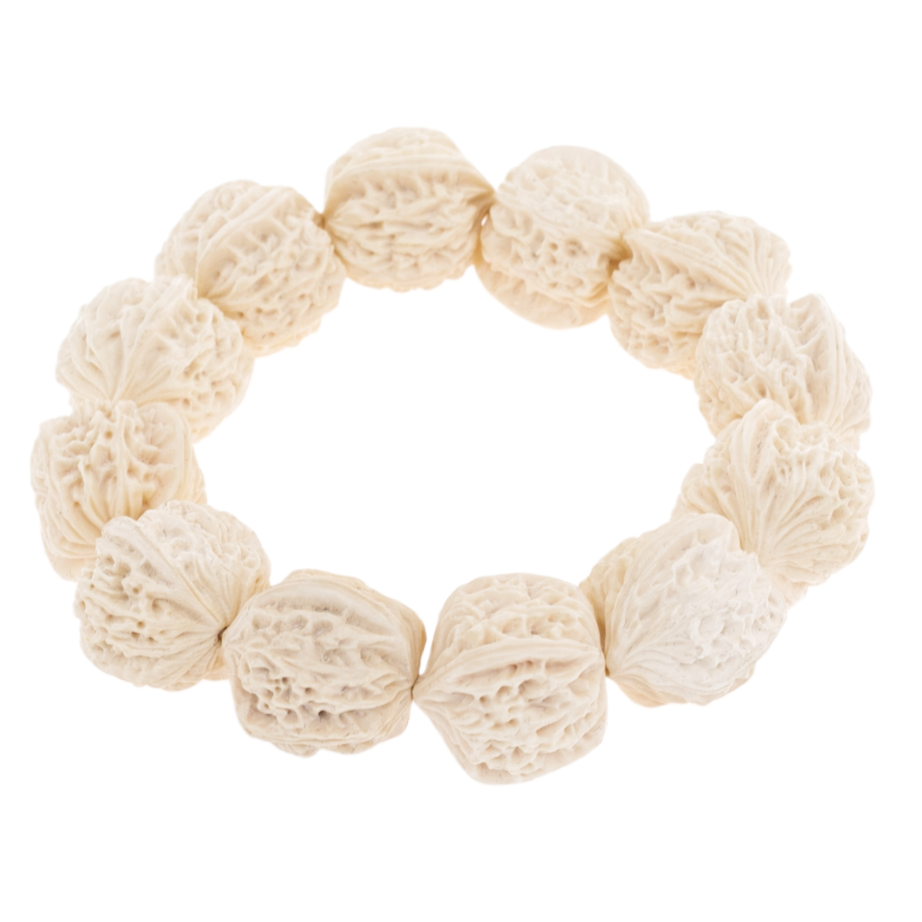 Браслет из бивня мамонта, оформленный в виде грецких орехов, рождает тонкую игру символов и форм. Каждая бусина выточена вручную с ювелирной точностью: поверхность будто повторяет рельеф скорлупы настоящего ореха, словно сжатая в материале энергия земли и древней мудрости. Неровности, изгибы, природная асимметрия — всё подчёркивает органичную живость и мастерство художника. Украшение собрано на эластичную нить, легко ложится по запястью и производит редкое впечатление артефакта, найденного в забытой шкатулке императрицы Востока. В комплекте — изящная коробка, обтянутая тканью с восточным орнаментом, подчеркивающая концепцию вещи как дара с историей.