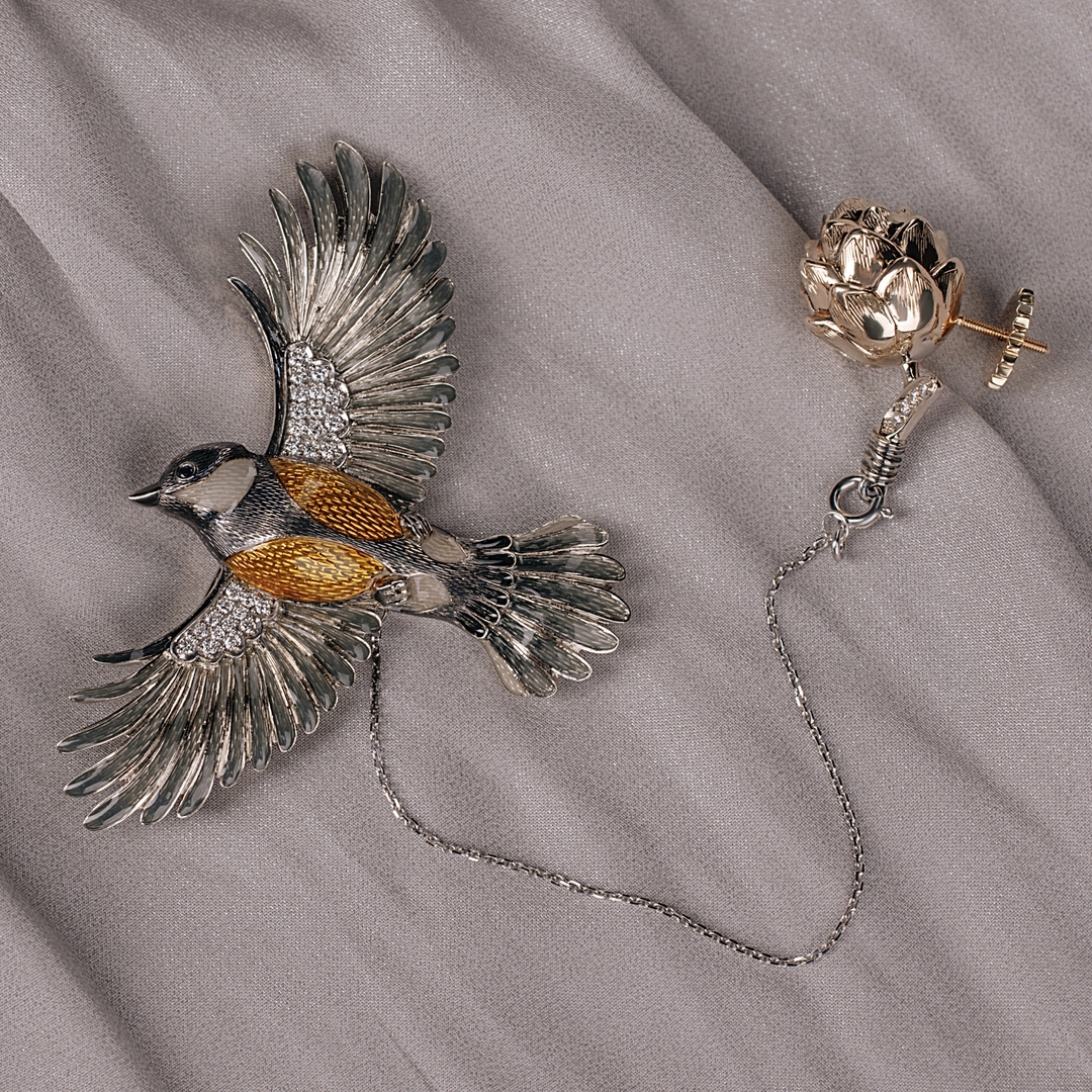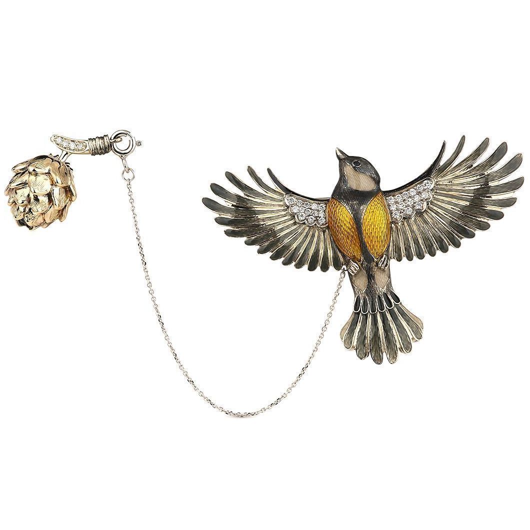 Брошь "Флора и фауна" из белого золота с сапфиром и бриллиантами