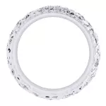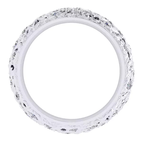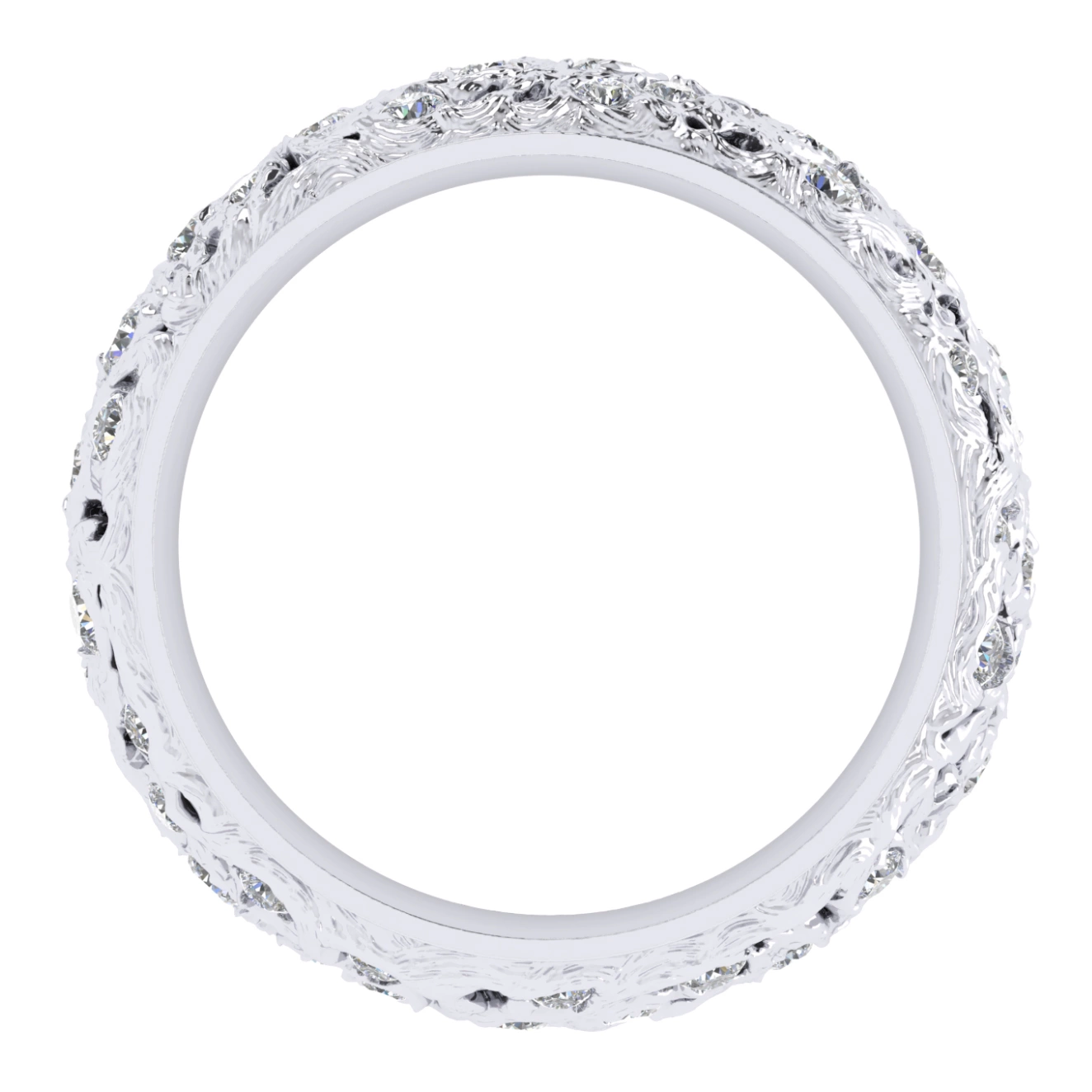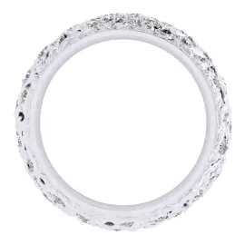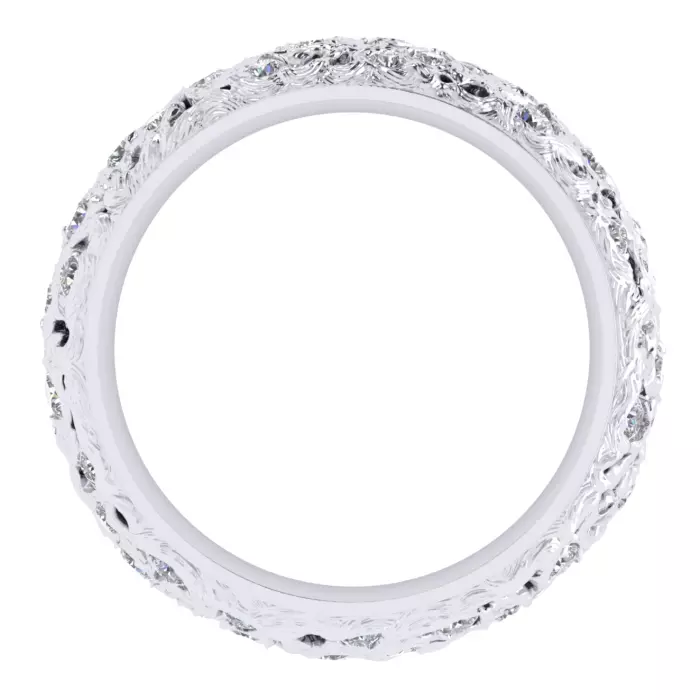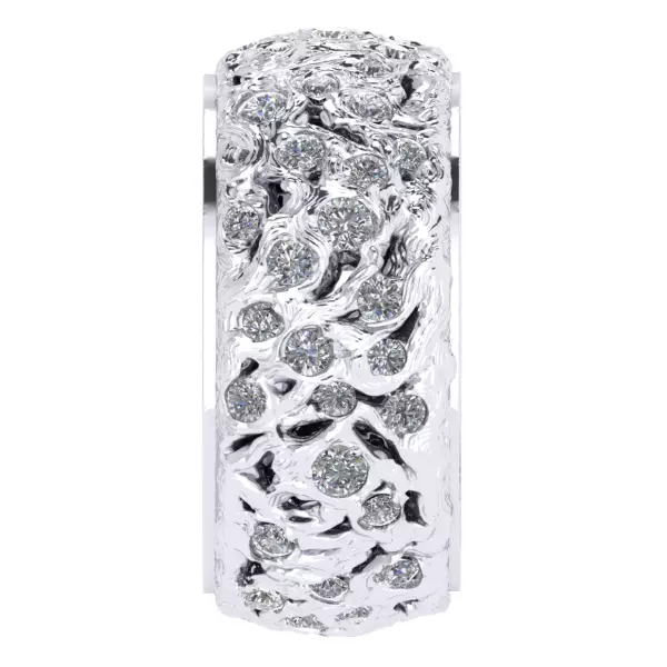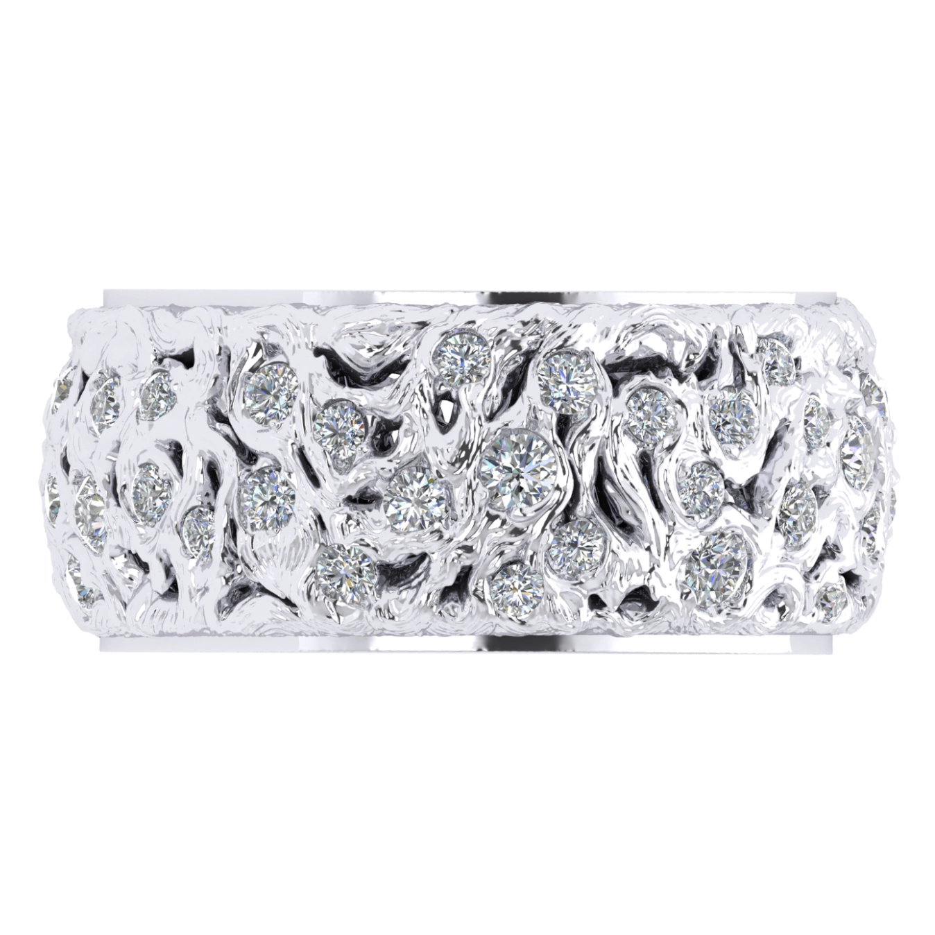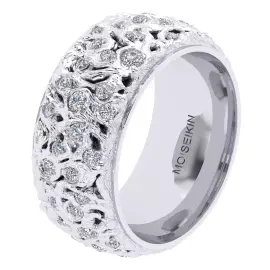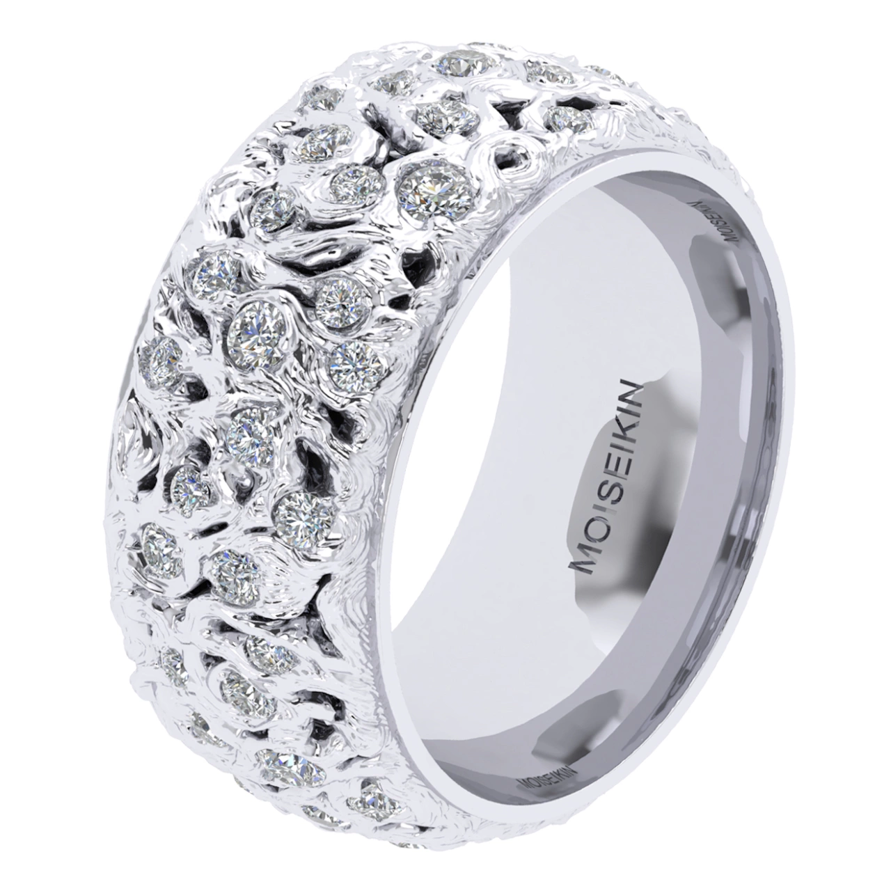 Основа выполнена из белого золота 750 пробы, чья благородная холодная поверхность подчёркивает игру света. По всей поверхности кольца рассыпаны бриллианты, закреплённые таким образом, чтобы каждый камень улавливал и отражал свет под разными углами. Благодаря этому создаётся эффект мерцающего звёздного неба, где множество огней складываются в единую живую композицию. Камни словно встроены в структуру металла, образуя органичный рельеф, а не просто декоративное покрытие.