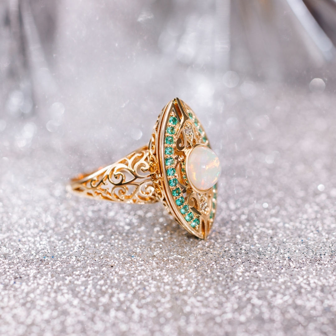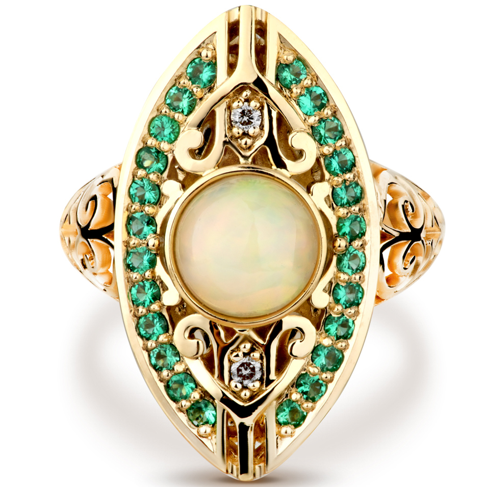 Кольцо "Килиманджаро" из желтого золота с опалом, изумрудами и бриллиантами
