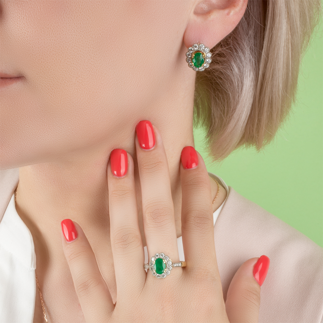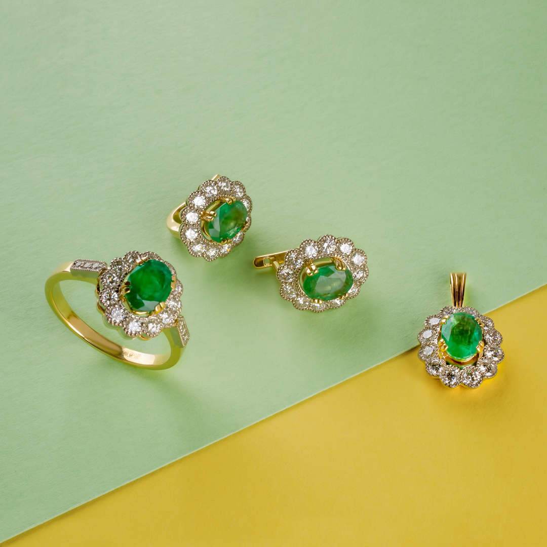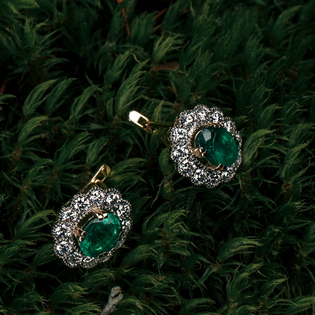 Серьги "Малинки" из желтого золота с бриллиантами и изумрудами