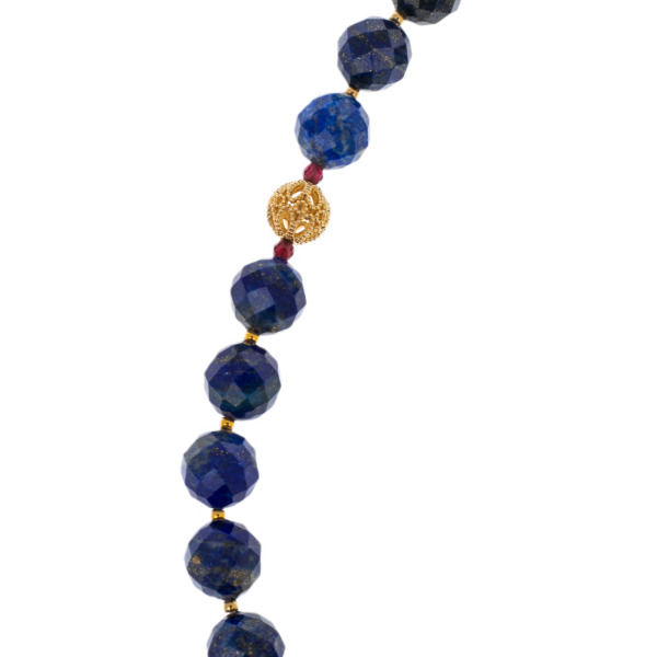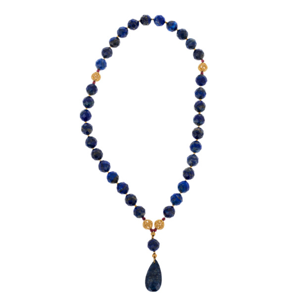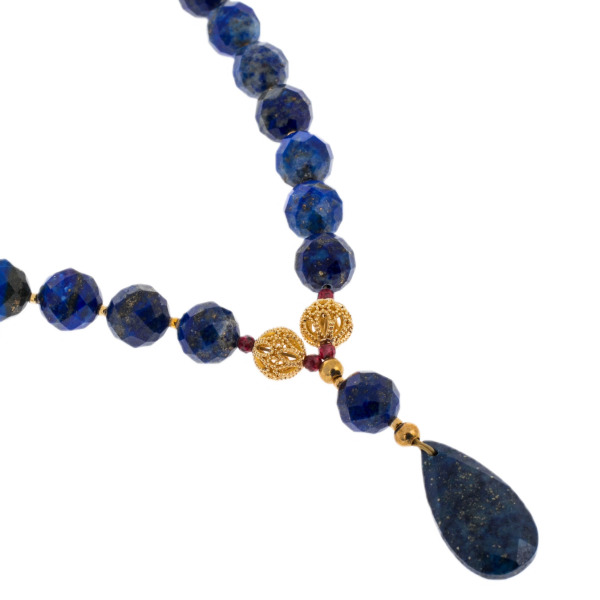 The rosary of lapis lazuli and garnet "Drop" is the embodiment of harmony, nobility and spiritual depth. The smooth faceted lapis lazuli beads strike with a rich shade of the starry sky, where golden sparks flicker — like reflections of eternity. In ancient times, this stone was considered a symbol of truth, wisdom and connection with the sky, it helped to maintain clarity of thought and inner balance.