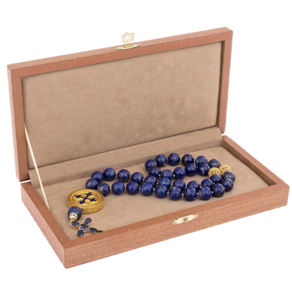 The Orthodox lapis lazuli rosary with an amulet is a spiritual and jewelry object that combines the power of prayer, the aesthetics of Russian church art and the craftsmanship of Zlatoust engraving. The deep, almost starry blue color of natural lapis lazuli forms a clear and weighty ring of perfectly polished balls, complemented by two golden inserts symbolizing light and grace. The central accent is a massive gilded amulet with a cross made using the technique of hand engraving and hot enamel, an ancient craft tradition elevated to the rank of high spiritual symbolism.
