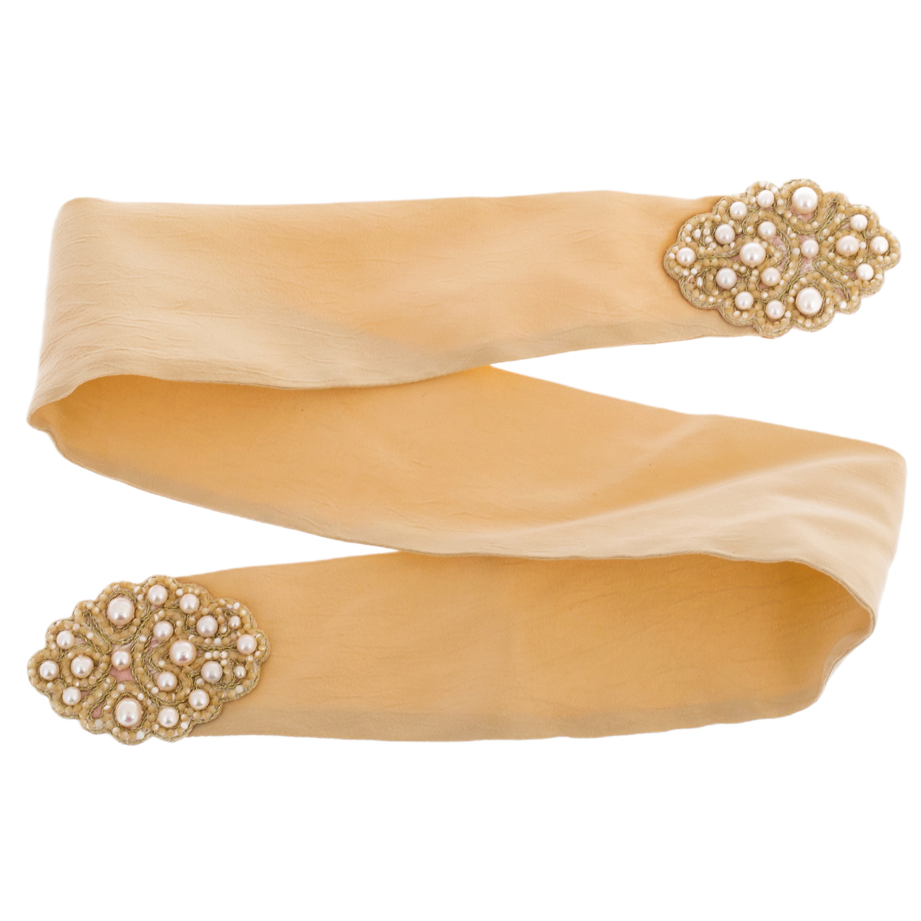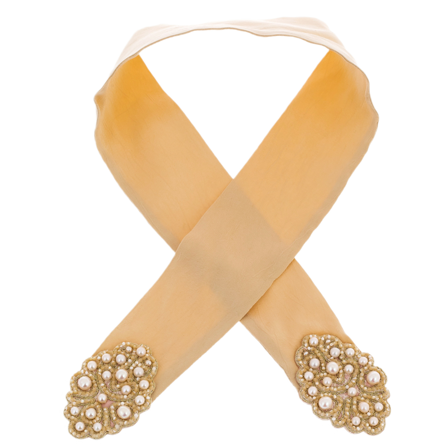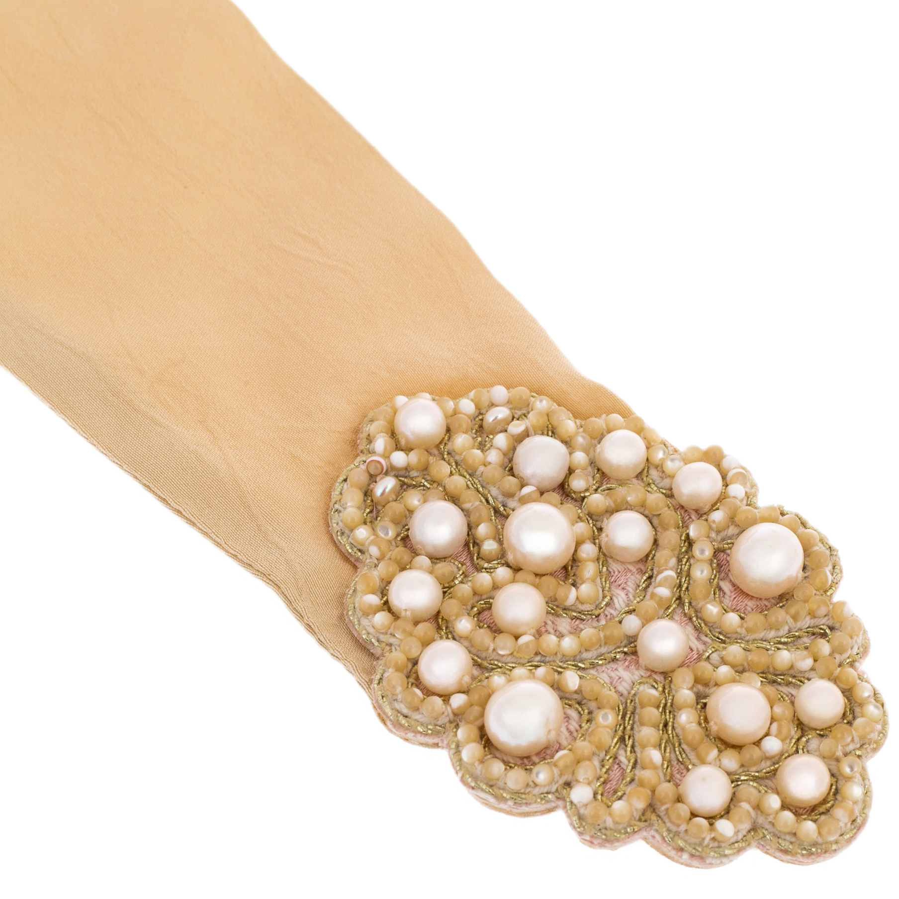 This scarf is made of noble textiles in an exquisite beige shade — the color of aristocratic restraint, purity and refined taste. Its soft, warm shades remind of ancient silks, autumn sun and sandy dunes, giving rise to images of calm confidence and harmony. The edges are crowned with exquisite hand-embroidered elements made from pearls and the smallest beads, like the precious sewing of royal robes. Each pearl plays with highlights, like drops of morning dew gathered in the silence of an ancient Russian forest. The ornament, executed by the best artisans, recalls the legacy of ancient Russian patterns, where each curl holds a secret meaning hidden from prying eyes.