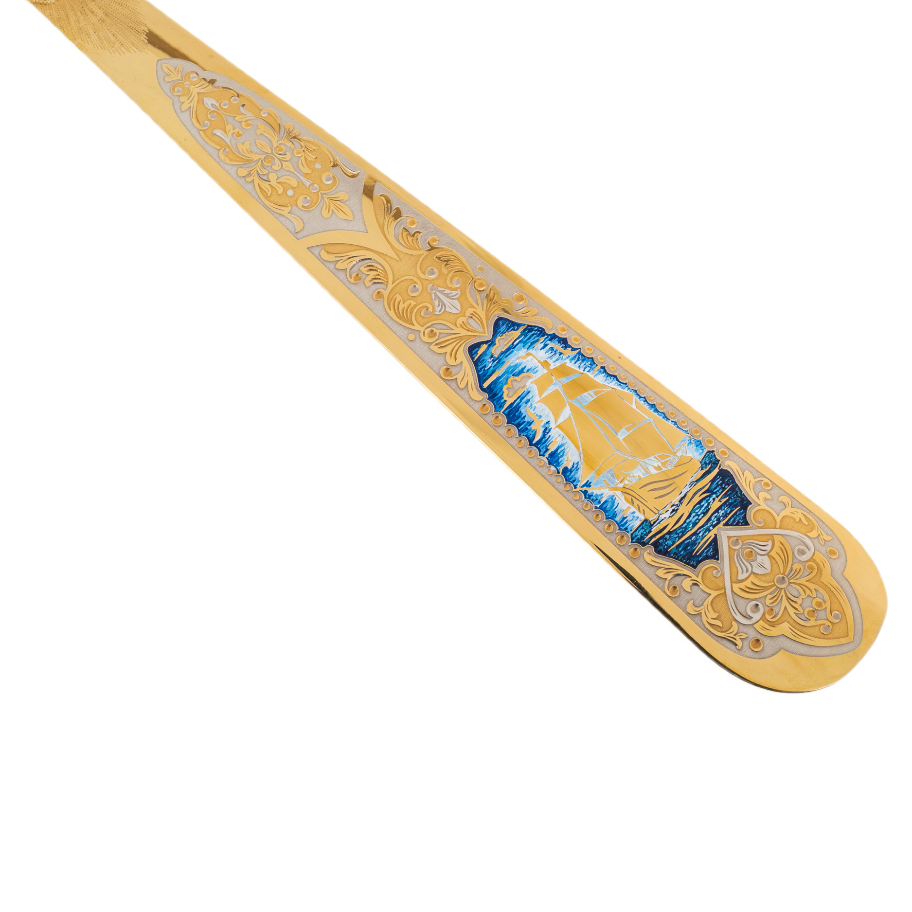 The combination of high-quality materials and elegant design makes this spoon a real work of art. The metal surface, reflecting light like the surface of the sea, emphasizes the luxury and status of the owner. Smooth lines and graceful shapes create a feeling of lightness and harmony, and a unique marine motif, executed with special skill, adds a touch of mystery and romance.
